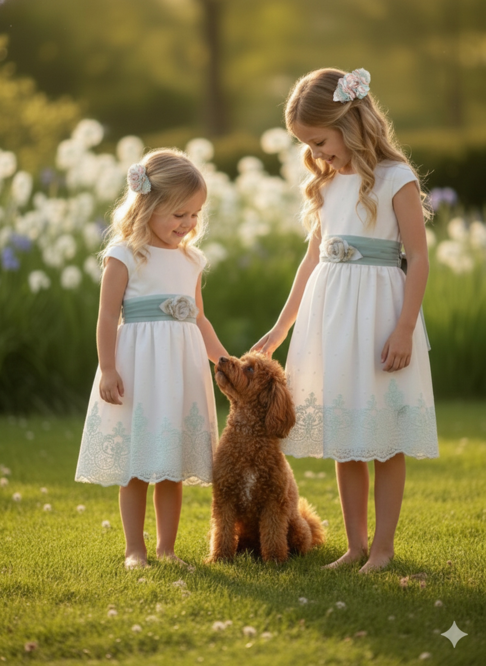 Hay miradas que lo dicen todo: hermanas, primas o acompañantes vestidas en armonía, compartiendo un momento que quedará para siempre en la memoria familiar. Este detalle floral para el pelo está pensado para crear esa magia: coordinar, unir y emocionar en Ceremonias infantiles.