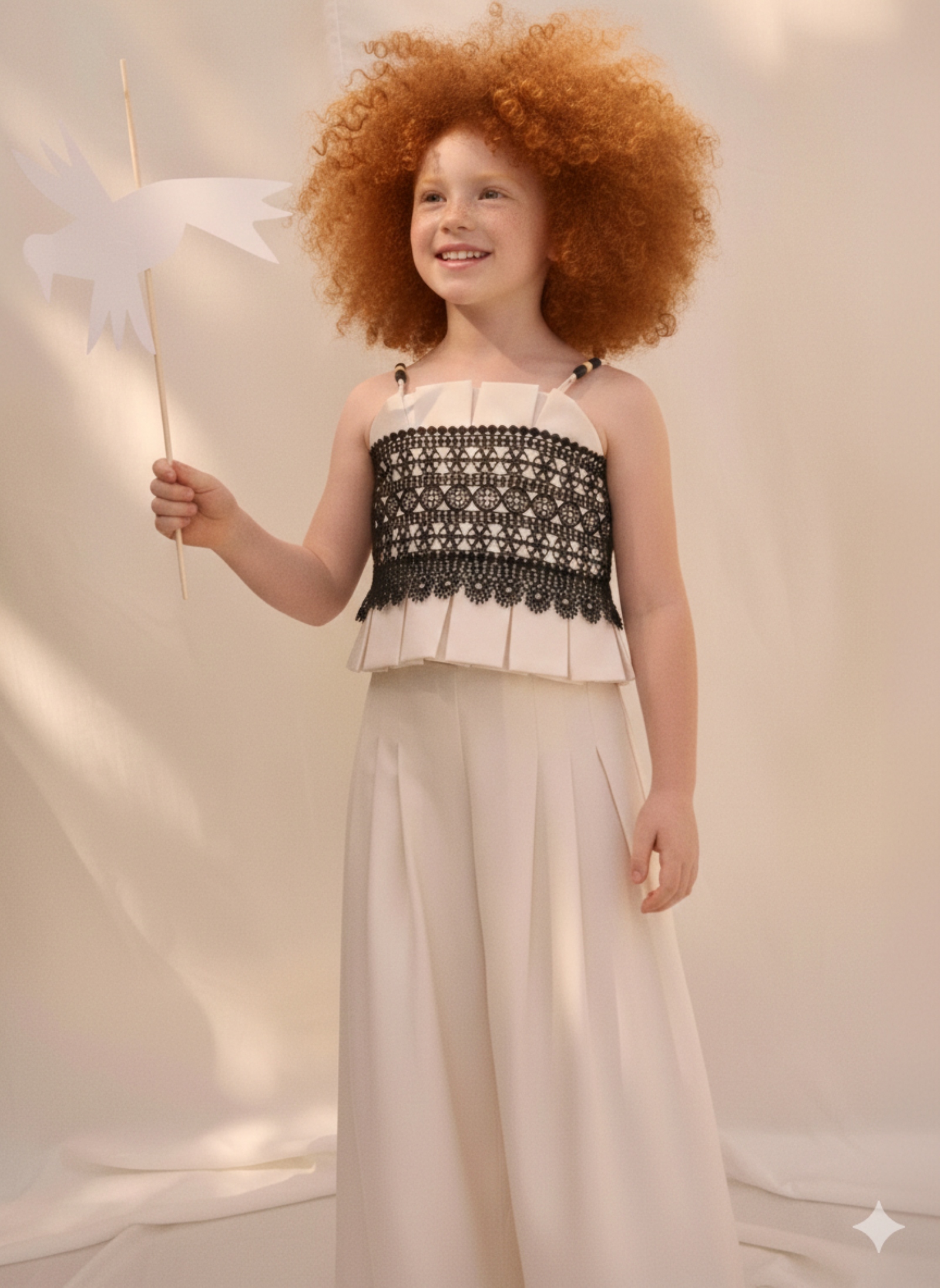 El pantalón amplio de corte fluido, en tono crudo, equilibra el conjunto aportando movimiento, comodidad y una silueta estilizada. Un diseño fresco y elegante, muy alineado con la moda de Ceremonia infantil contemporánea, firmado por Abel & Lula.