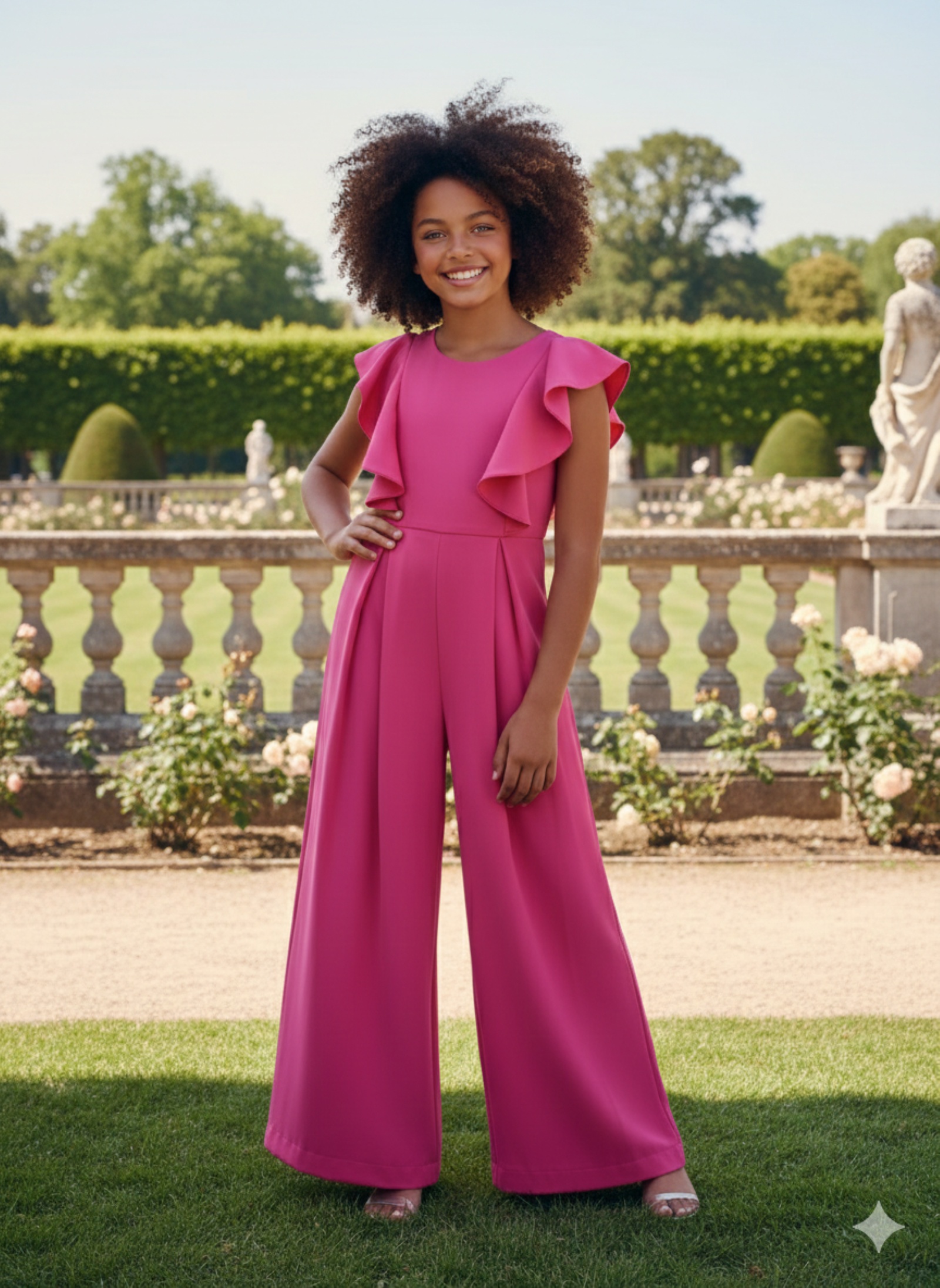 Este mono de niña es la definición perfecta de “moda con carácter”. Su color fucsia vibrante transmite alegría y seguridad, y su diseño elegante con volantes en los hombros añade un movimiento precioso que lo hace ideal para bailar, posar o simplemente disfrutar del evento.