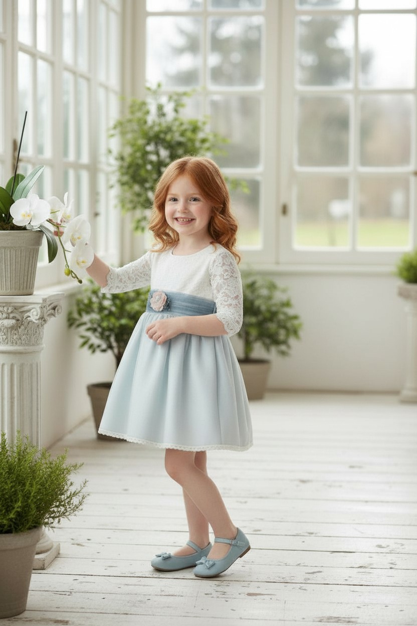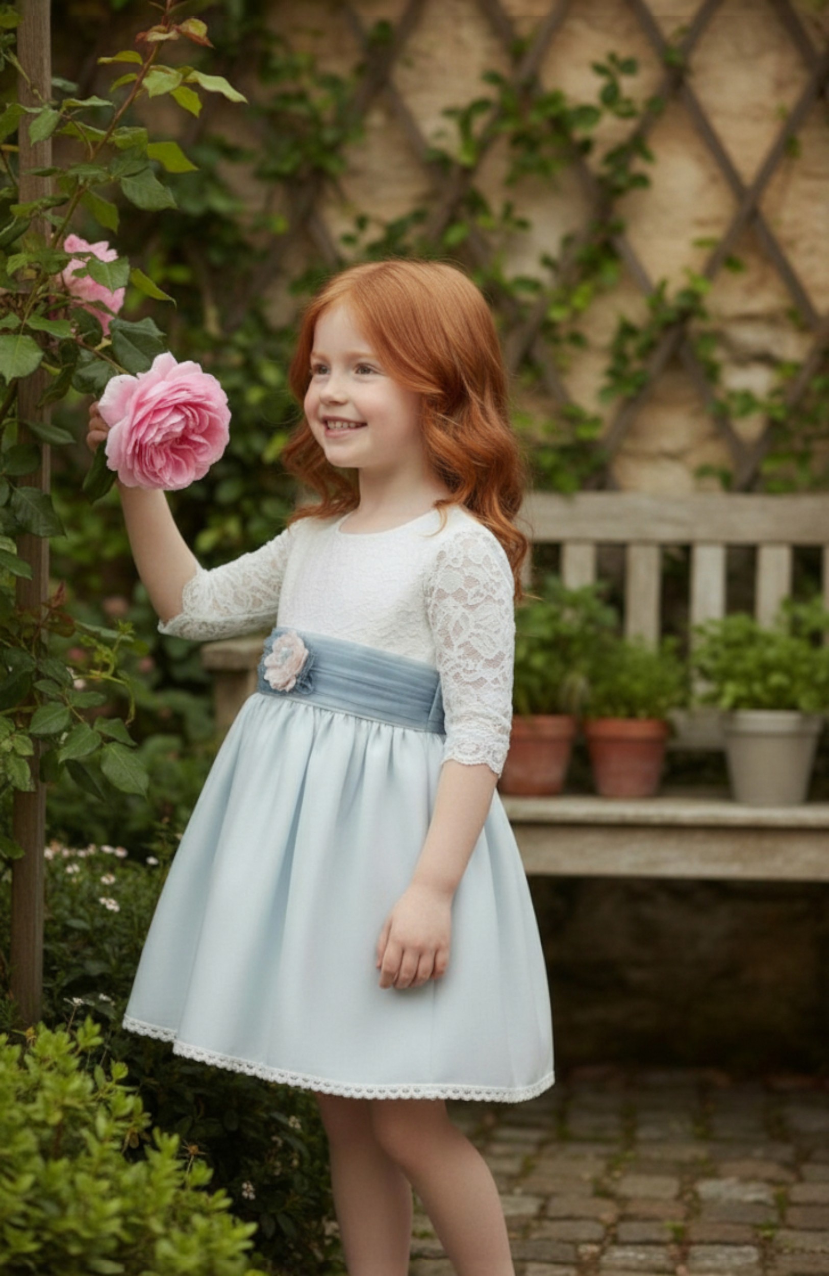 Cuerpo en tono crudo con encaje y manga francesa, elegante y delicado. La falda en azul empolvado con caída suave aporta movimiento y un aire romántico. Cintura marcada con fajín a juego y detalle floral, para un acabado de ropa elegante para niña lleno de ternura.
