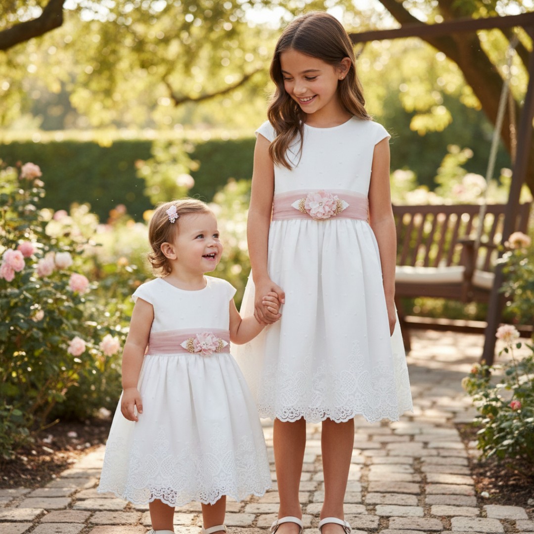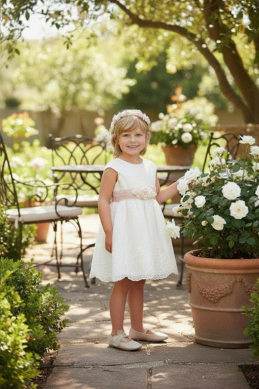 Modelo en blanco roto, sin mangas y con cuerpo liso de líneas delicadas. La cintura se realza con un fajín rosa empolvado y detalle floral, y la falda con bordado y terminación ondulada aporta ese aire de moda de Ceremonia infantil que enamora en fotos y en directo.