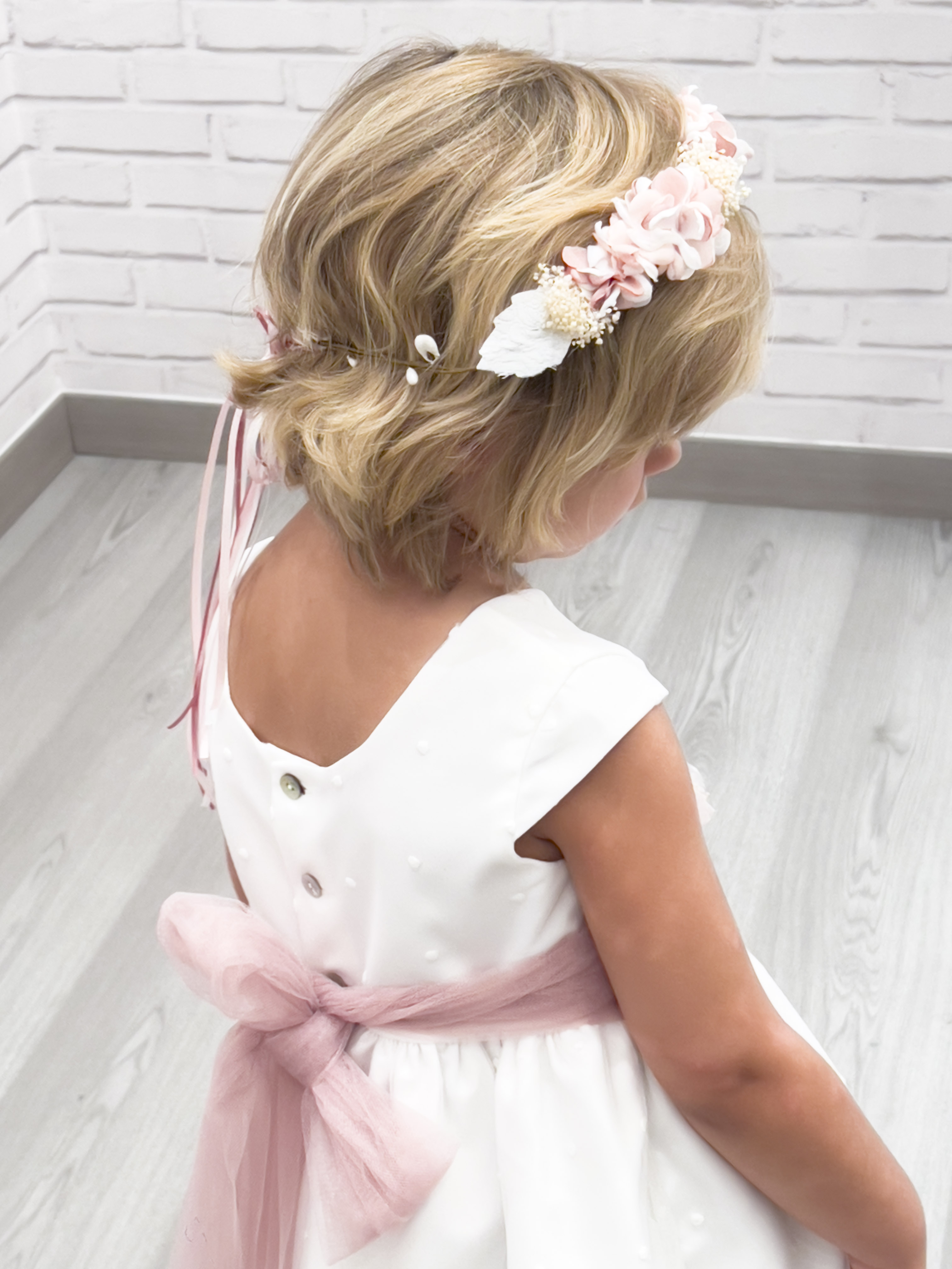 Vestido de Ceremonia niña en blanco roto con fajín rosa empolvado (tallas 3 a 16 años)