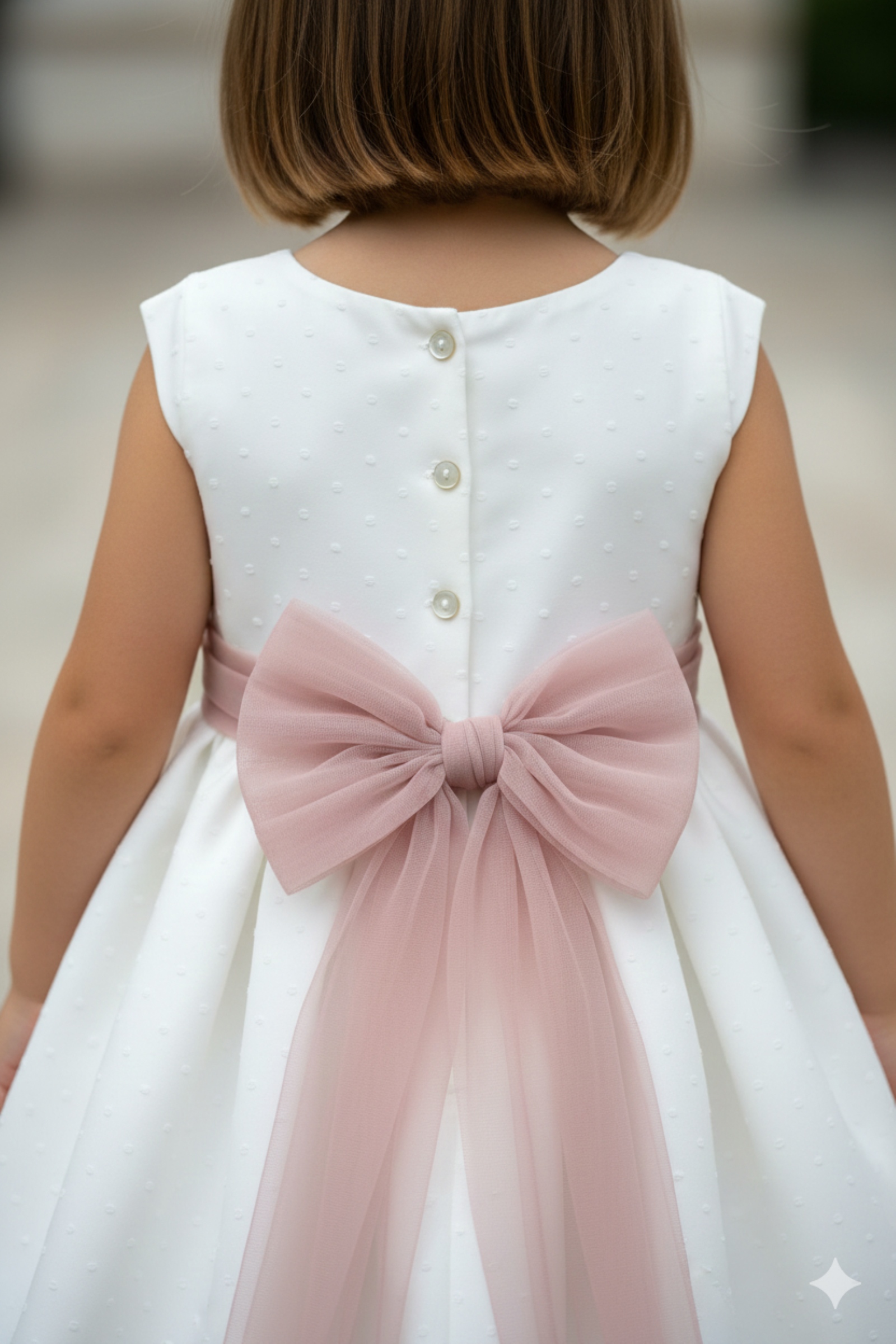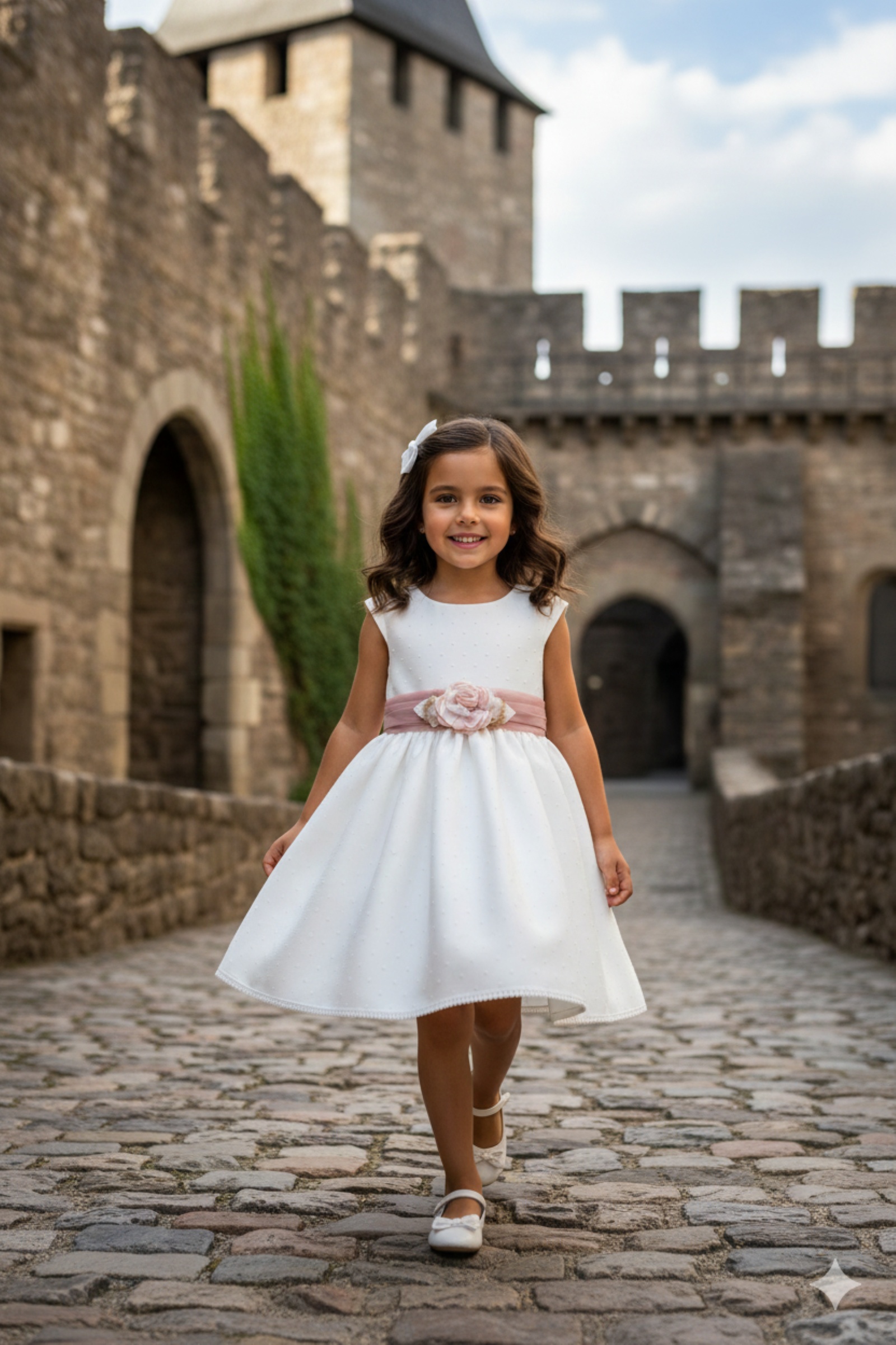Vestido de Ceremonia para Niña en Gasa de Topos Crudo con Fajín Rosa Empolvado Elegancia dulce para Arras, Comunión y Cumpleaños Especiales
