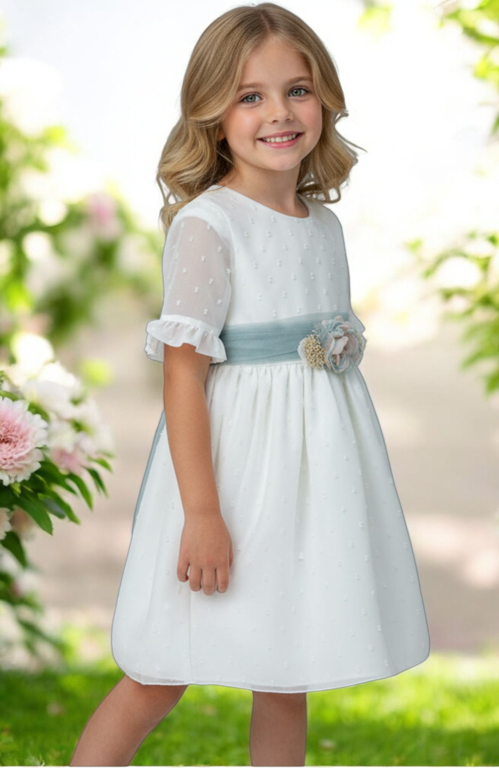 Confeccionado con un corte limpio y favorecedor, este vestido realza la silueta infantil con un estilo romántico y actual. El tejido de plumeti en cuerpo y falda aporta una textura delicada, mientras que el fajín de tul verde empolvado, decorado con una flor central, crea un contraste suave y armonioso. Las mangas francesas semitransparentes con volante y la botonadura trasera completan un acabado impecable.
