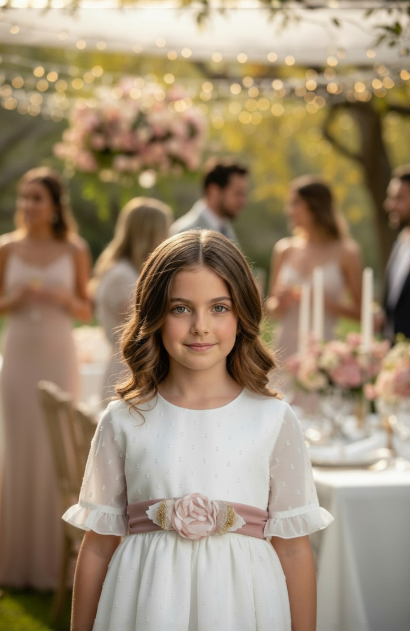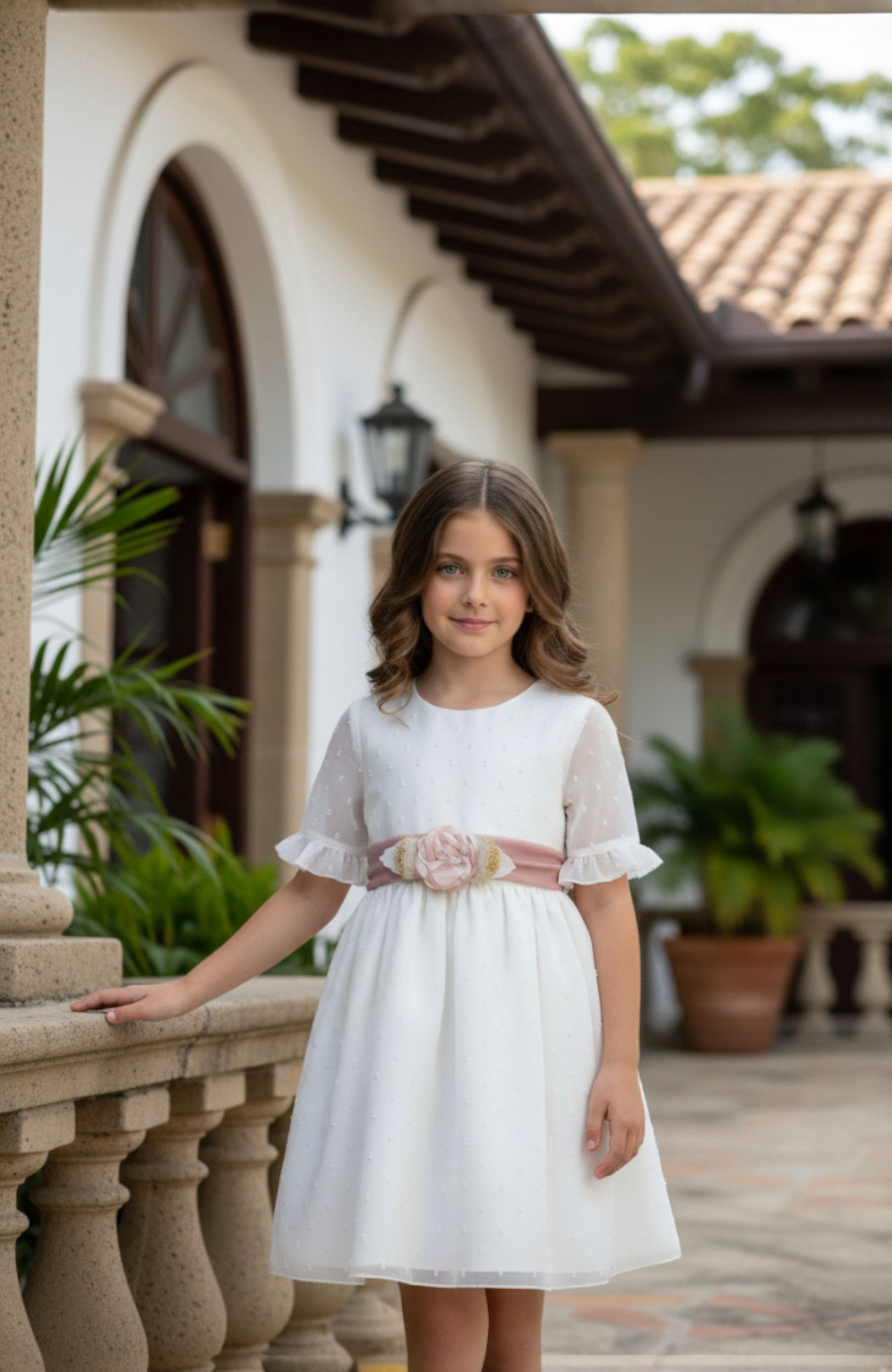 Vestido de Ceremonia para Niña en Gasa de Topos con Fajín Rosa Empolvado. Un diseño dulce y elegante para Arras, Bodas y Celebraciones Especiales