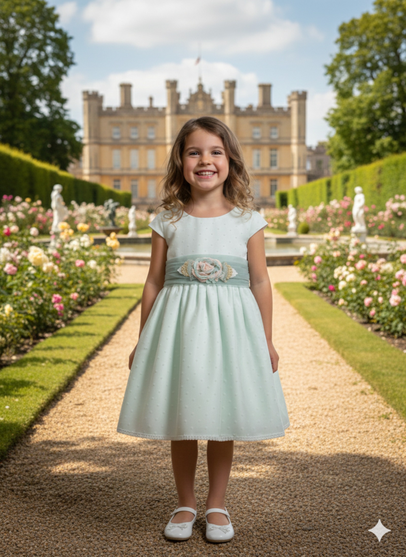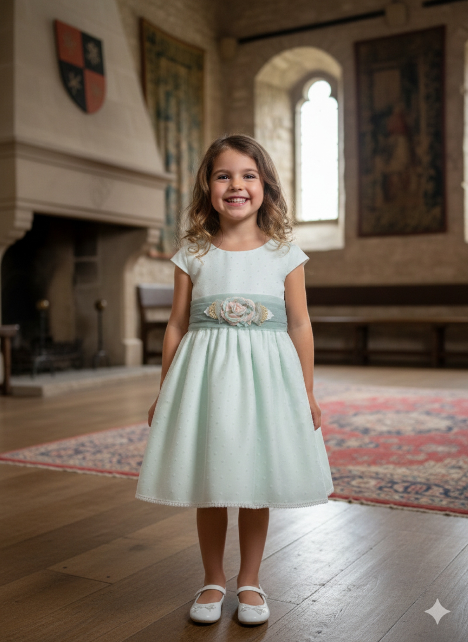 Este vestido de niña en gasa de topos verde empolvado conquista por su suavidad, su movimiento ligero y su capacidad para iluminar cualquier celebración. El cuerpo sencillo y elegante se combina con una falda vaporosa y un fajín artesanal a tono, decorado con flores en relieve, que aporta un toque romántico y muy delicado.