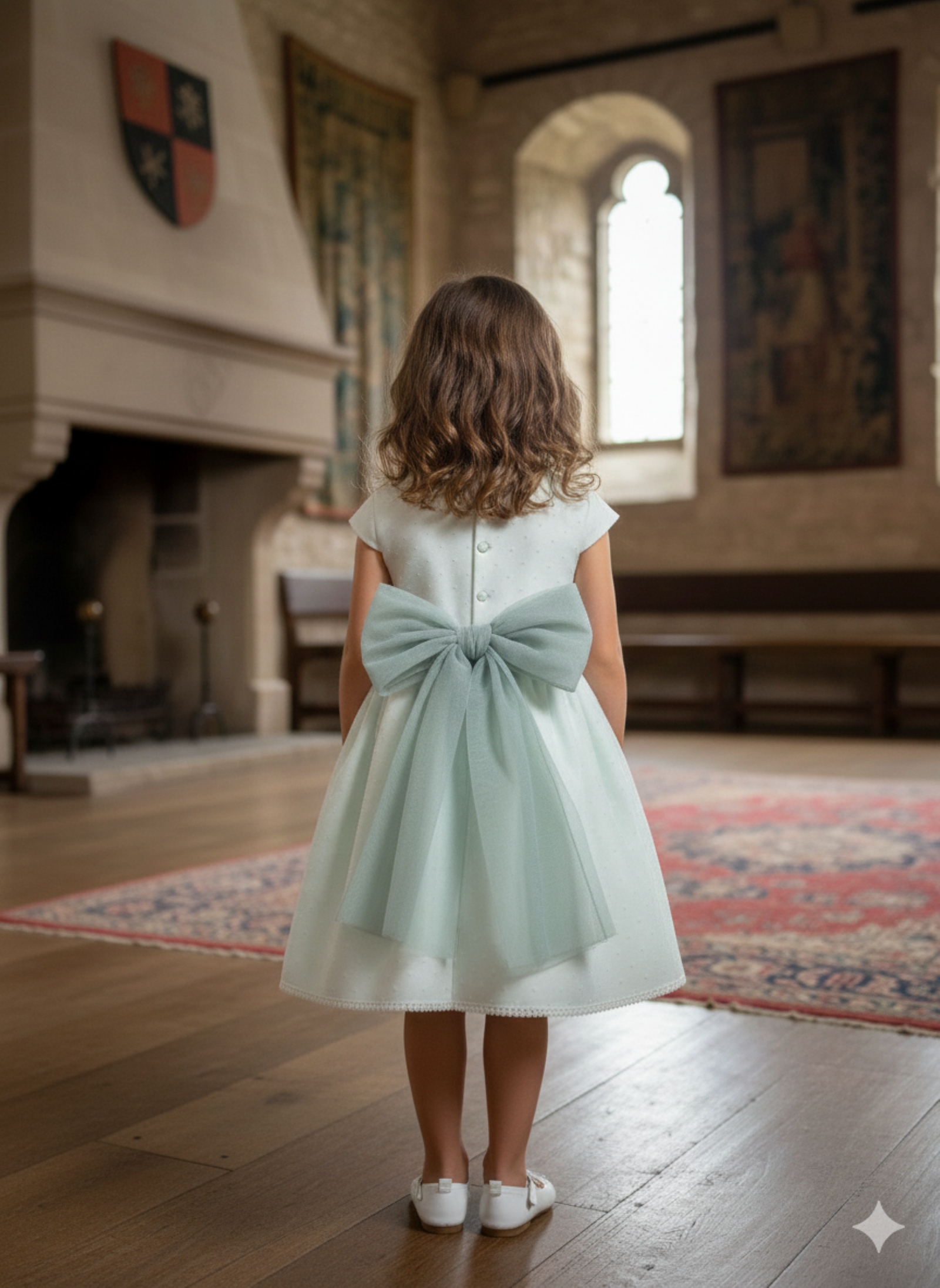 Vestido de Ceremonia para Niña en Gasa de Topos Verde Empolvado Dulzura y estilo para Arras, Comunión y Eventos Especiales