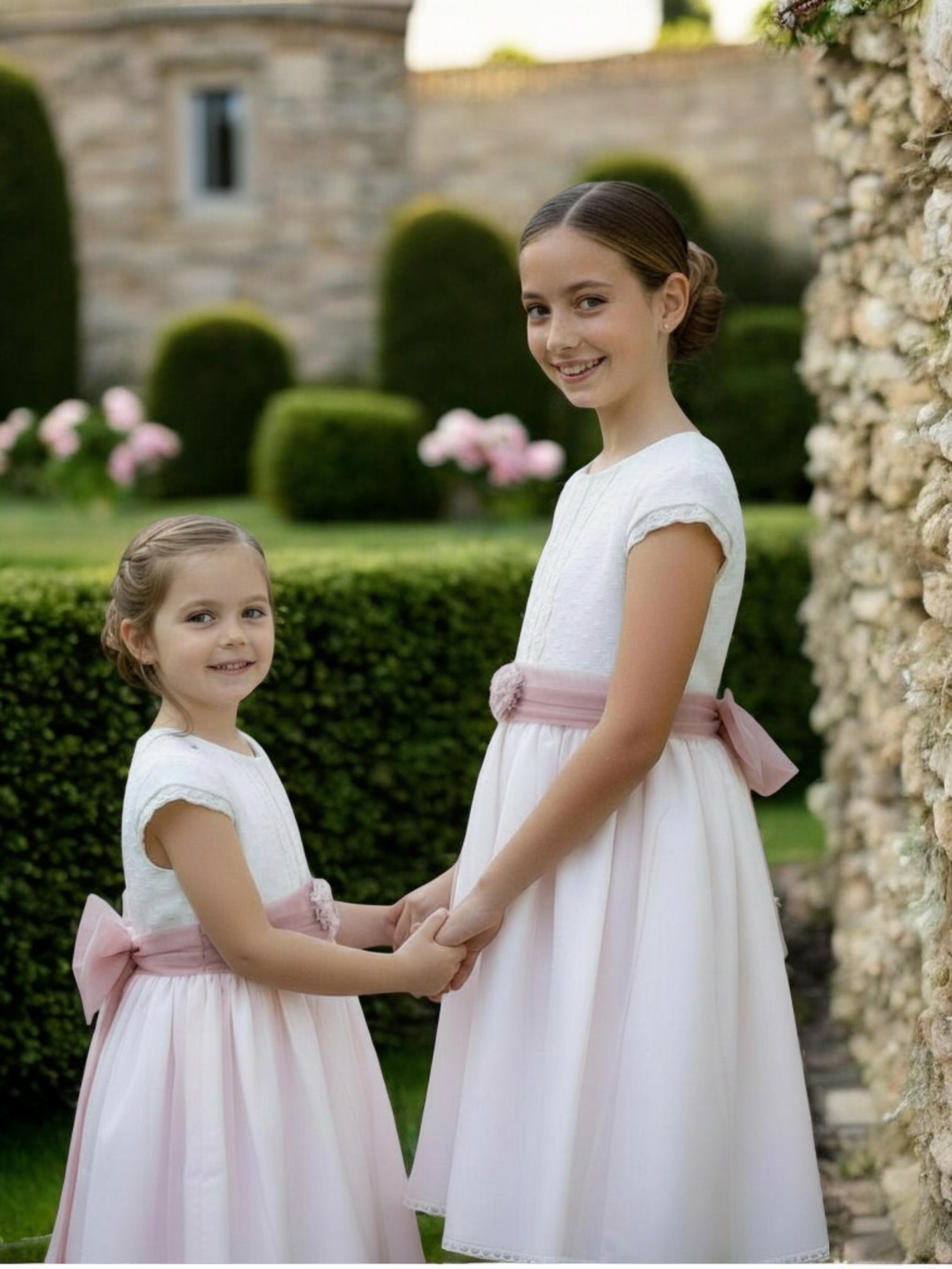 Cuerpo en tono crudo con textura sutil y manga corta, combinado con una falda vaporosa en rosa empolvado de caída dulce. La cintura se realza con fajín y flor central, creando un look equilibrado y fotogénico: ropa elegante para niña y vestidos elegantes para niñas pequeñas para bodas, aniversarios, cumpleaños y celebraciones familiares.