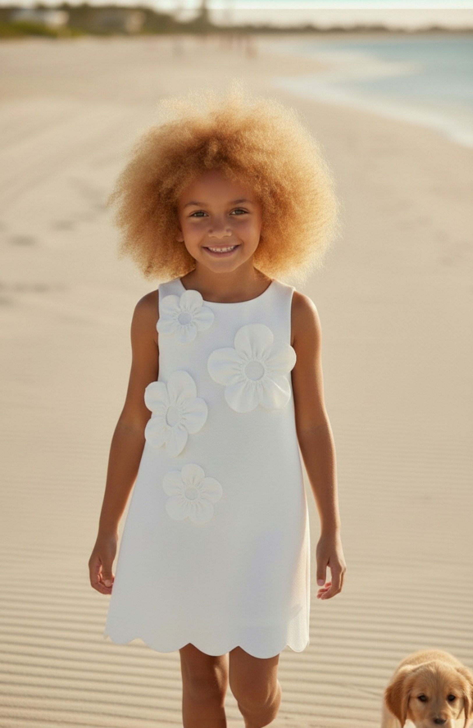 Confeccionado en un tono crudo luminoso, este vestido destaca por su silueta recta y depurada, realzada con flores aplicadas en relieve que aportan textura y un aire artesanal muy cuidado.