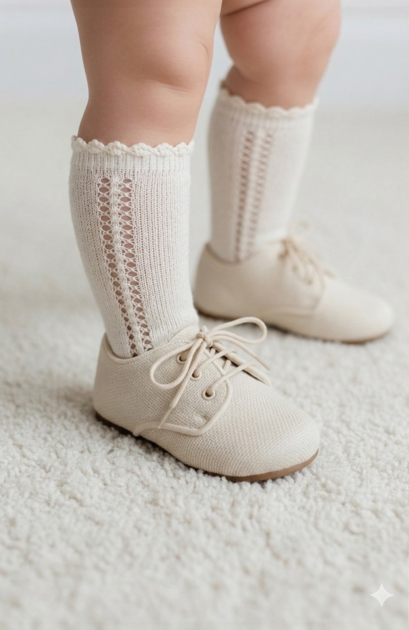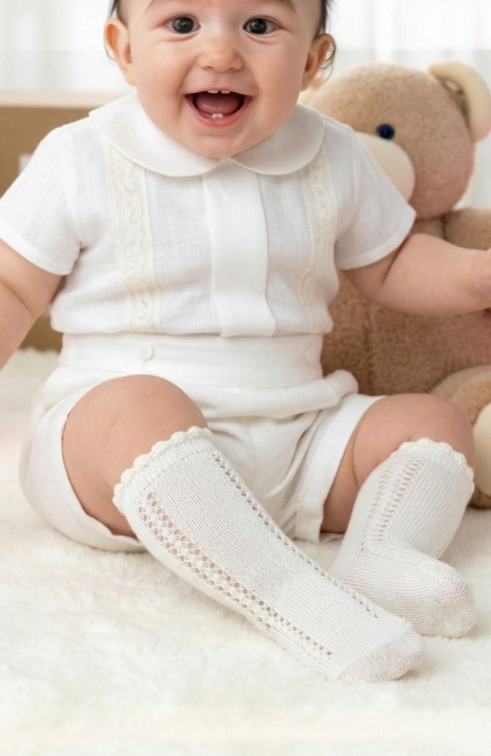 Confeccionada en algodón 100% de alta calidad, presenta un diseño calado vertical sutil y elegante que estiliza la pierna del bebé, con un acabado cuidado en la parte superior que se adapta suavemente sin apretar. Su tono crudo la convierte en una pieza imprescindible dentro de la moda de ceremonia infantil, perfecta para acompañar conjuntos de Bautizo o ropa elegante para niño en celebraciones y eventos familiares.
