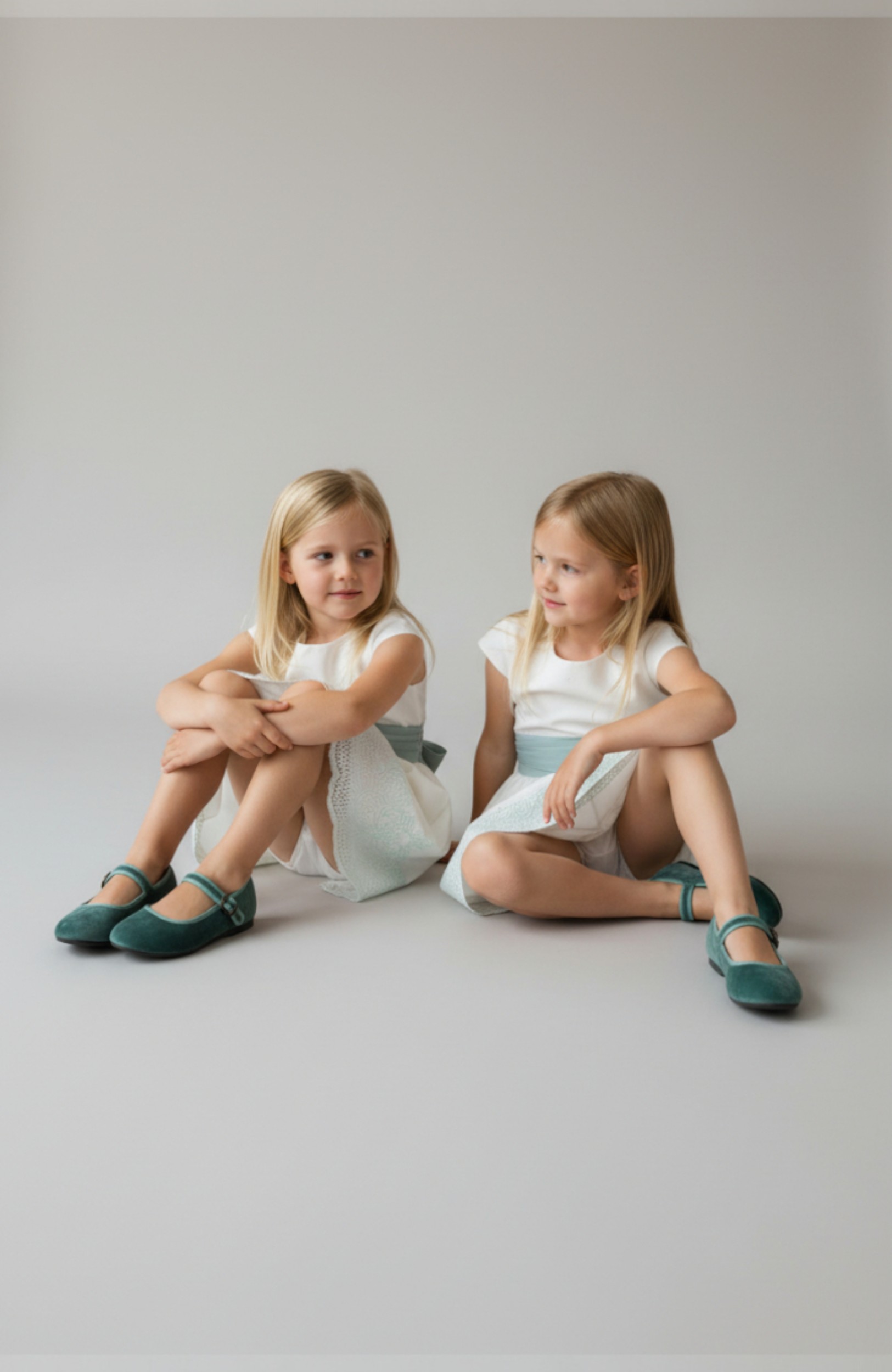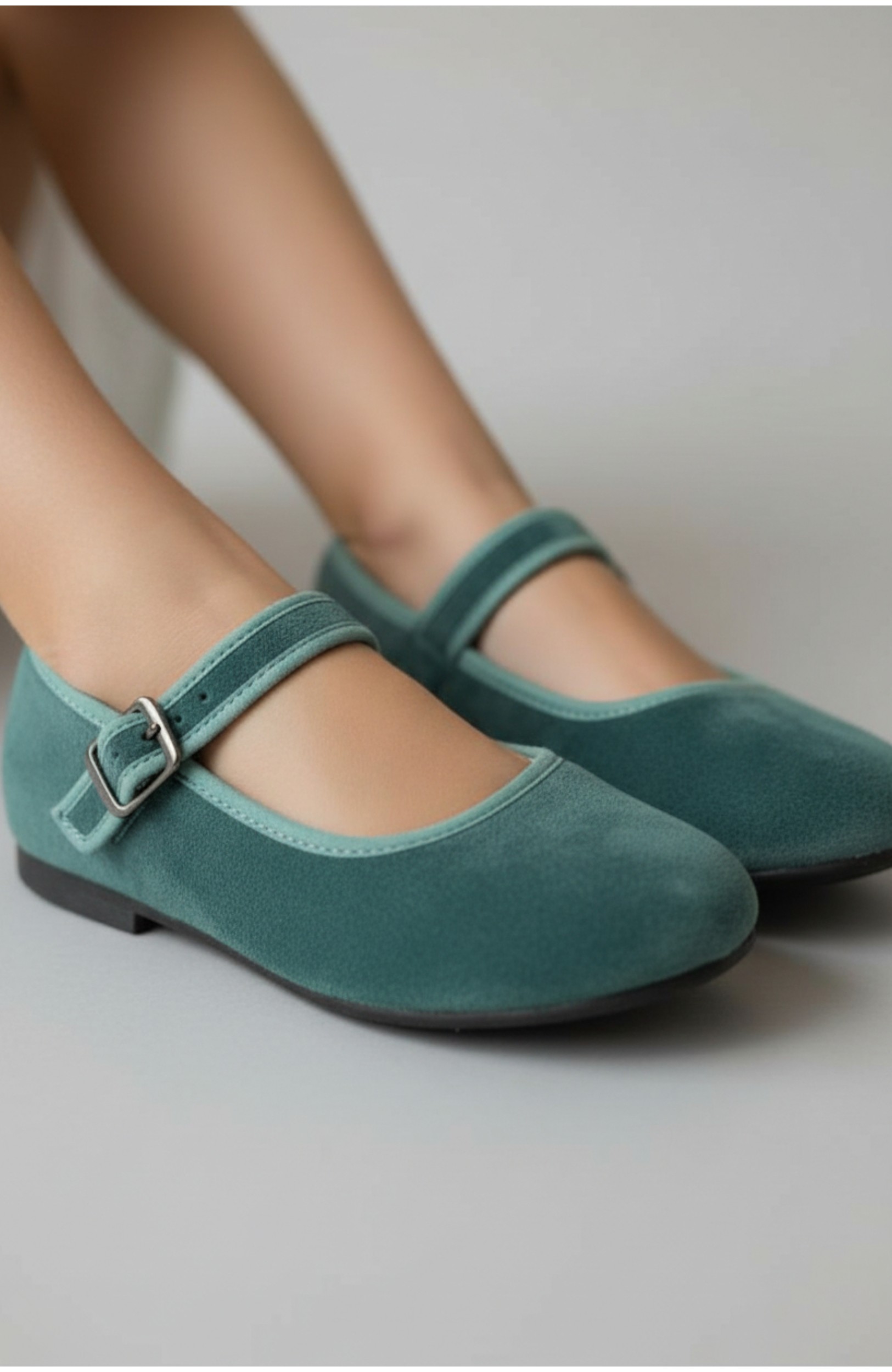 Merceditas de niña de terciopelo en tono verde empolvado. Un básico elegante que combina con vestidos de todo tipo