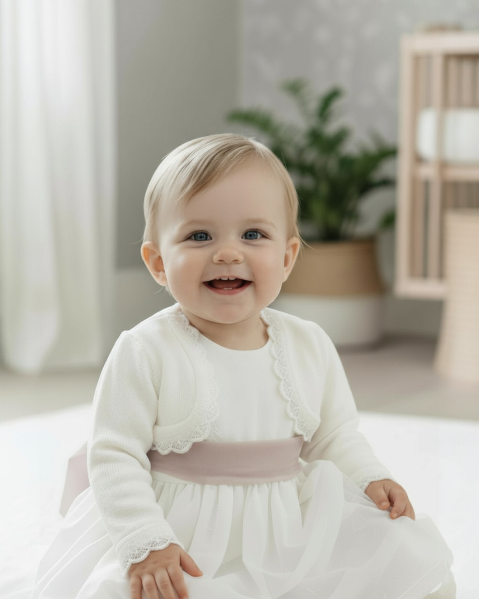 Este bolero abierto en tono crudo es el complemento perfecto para los momentos más especiales de tu bebé. Ideal para Bautizos, Arras o celebraciones familiares, su delicado acabado calado en escote, puños y bajo aporta un aire artesanal y atemporal que enamora.