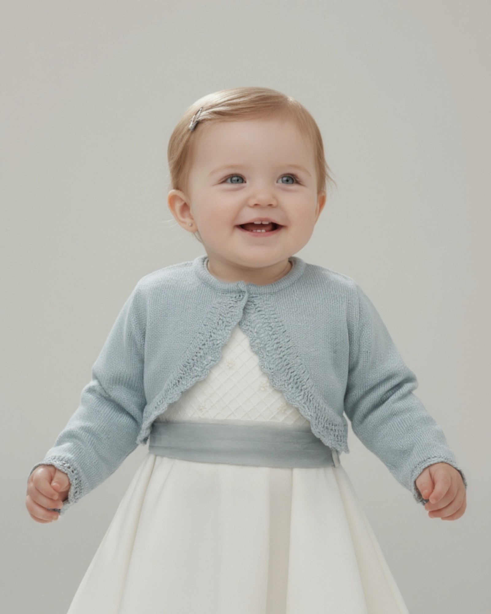 Perfecta para un look de Bautizo, cumpleaños o una comida familiar, aporta calidez sin perder ligereza y deja que el vestido luzca sin restar protagonismo. El tejido es suave y transpirable, pensado para la piel delicada de los más pequeños.