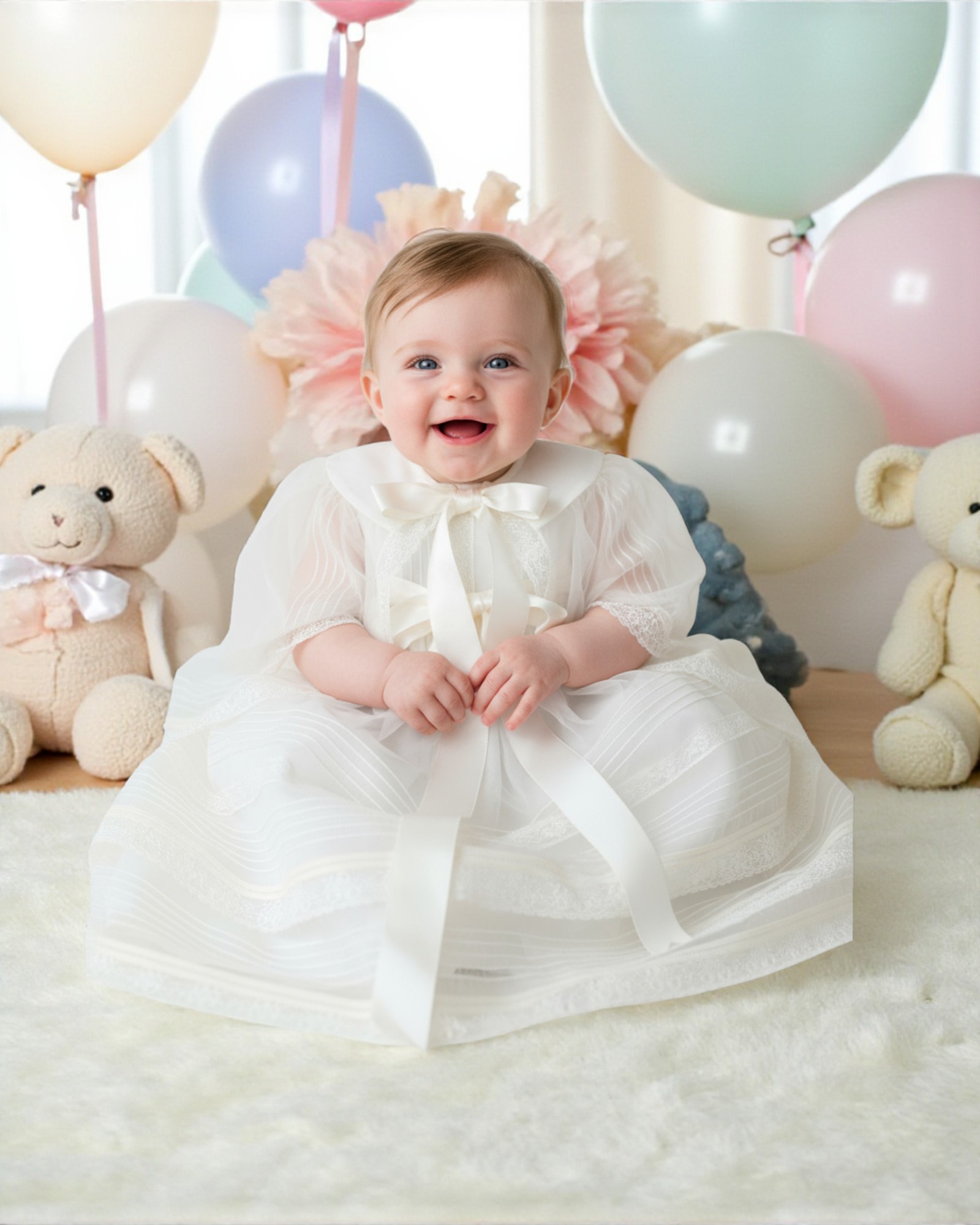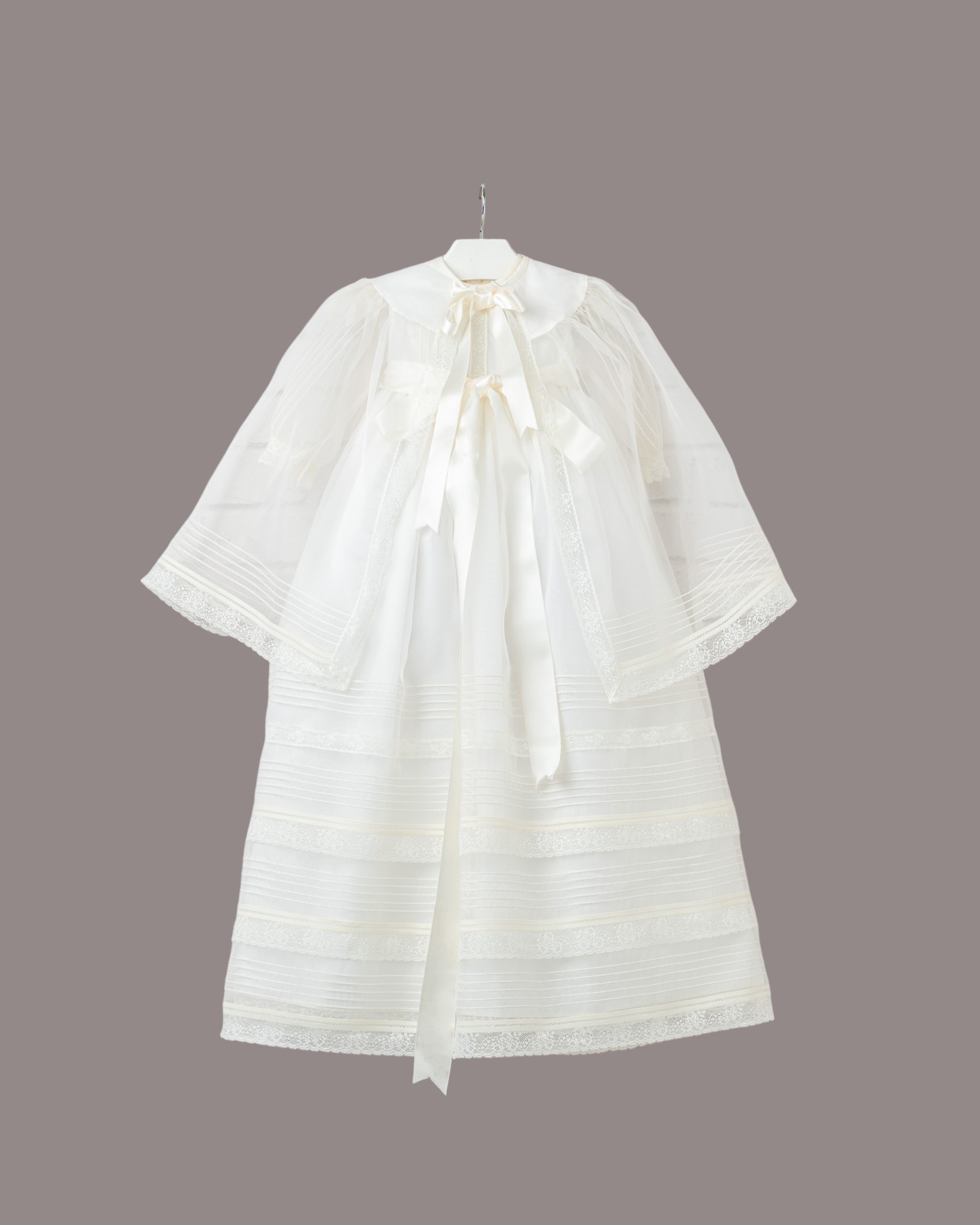 El ropón de Bautizo destaca por su cuerpo de manga larga en suave tejido semitransparente con finos detalles de encaje y delicados bordados. Su falda larga, abierta en la parte trasera, está adornada con franjas cuidadosamente diseñadas que aportan volumen y movimiento. La capa a juego, delicadamente confeccionada con tul vaporoso y lazos satinados, aporta un toque de distinción único, mientras que la capota complementa perfectamente este look, protegiendo a tu bebé con un estilo refinado y dulce.