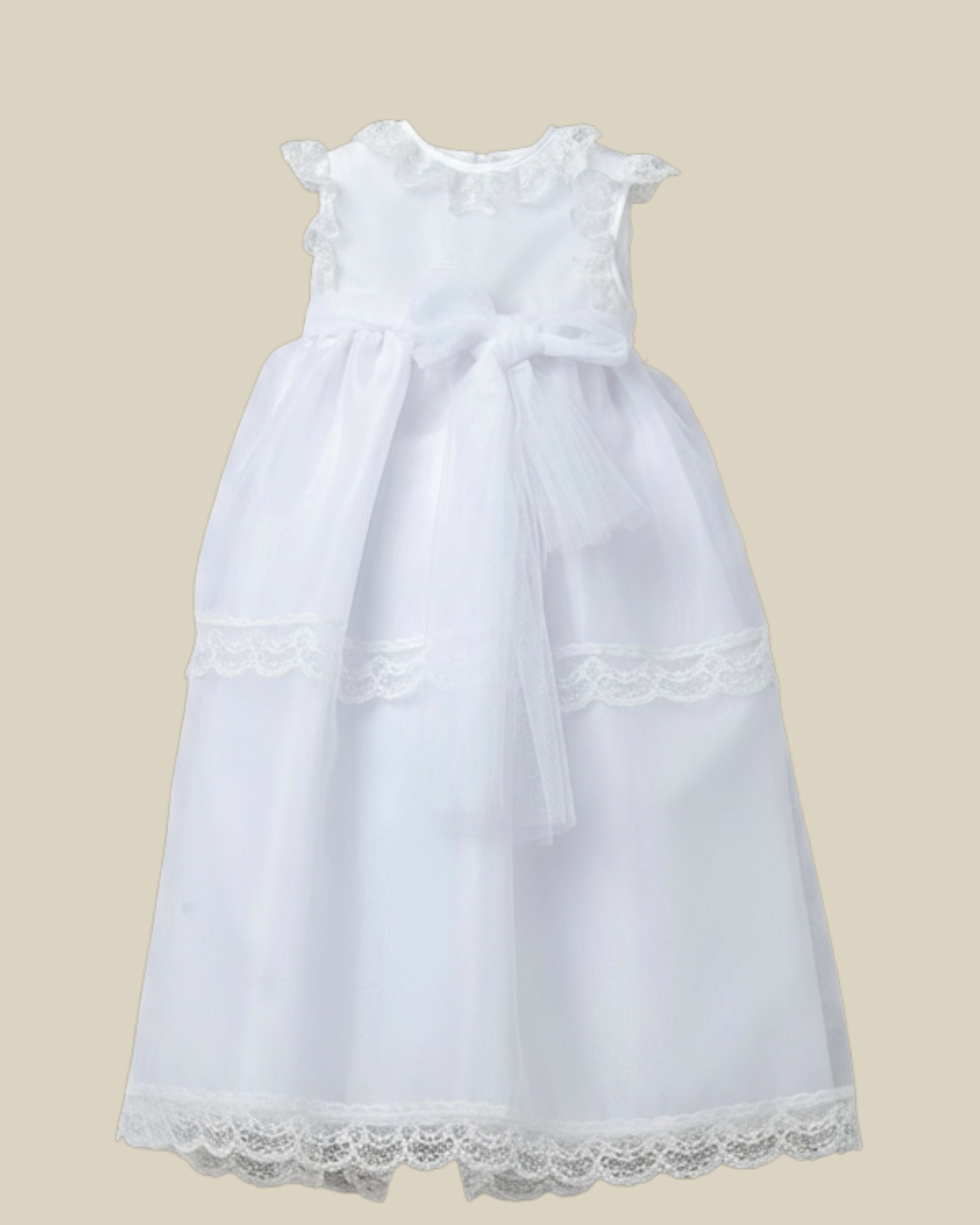 Confeccionado en un blanco radiante, este faldón sin mangas luce detalles de puntilla en cuello, sisa y bajo, aportando un aire romántico y atemporal. Su falda, abierta en la parte trasera, combina encaje y tul con gracia y sencillez, mientras que la capota a juego remata el conjunto con suavidad y armonía.