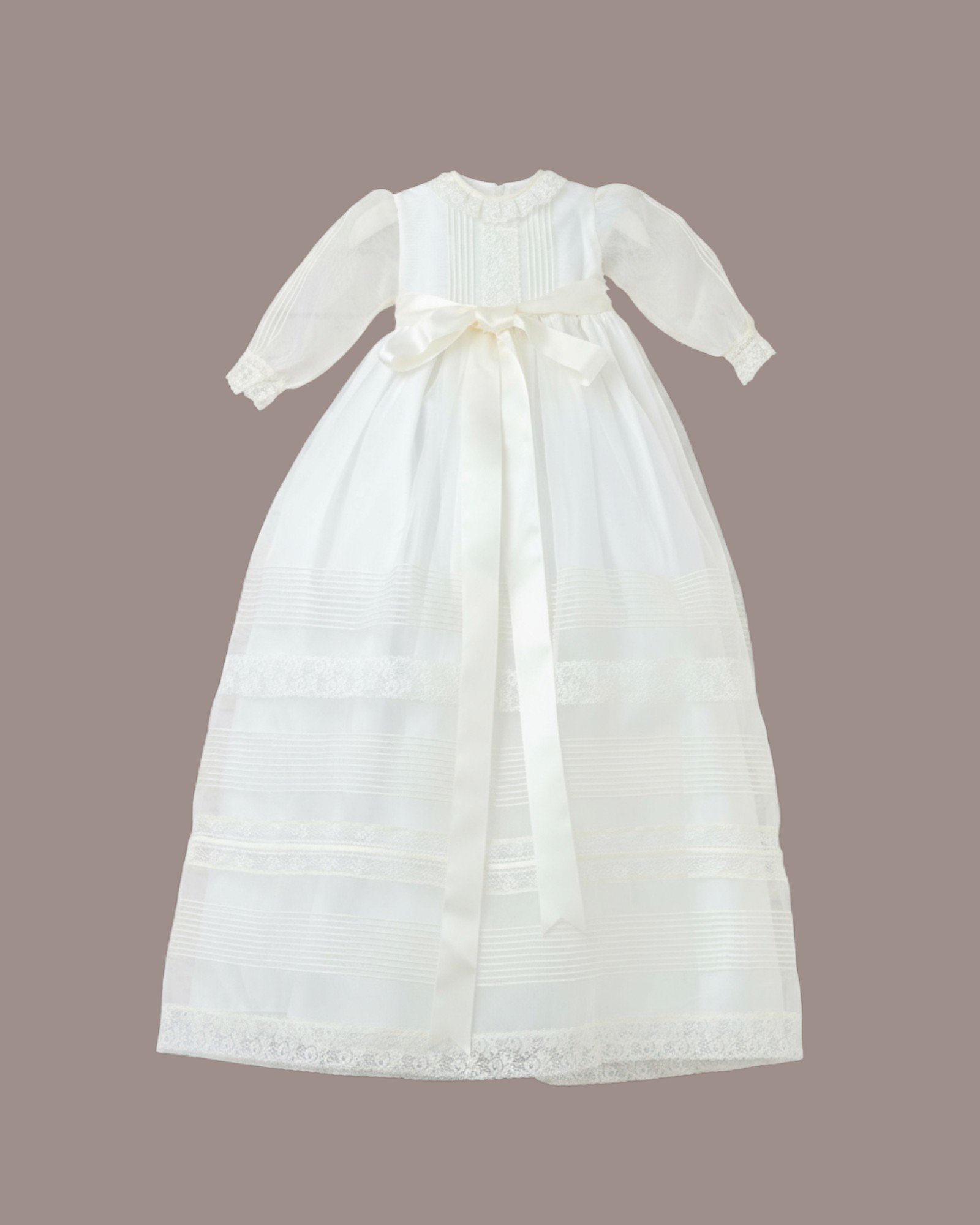 Este precioso ropón de Bautizo presenta un elegante cuerpo de manga larga con suaves transparencias, delicadamente adornado con encajes finos y bordados sutiles. Su falda larga, vaporosa y con terminaciones exquisitas de encaje y jaretas, proporciona un estilo lleno de refinamiento y pureza. La capota a juego complementa idealmente el conjunto, realzando la dulzura natural del bebé.