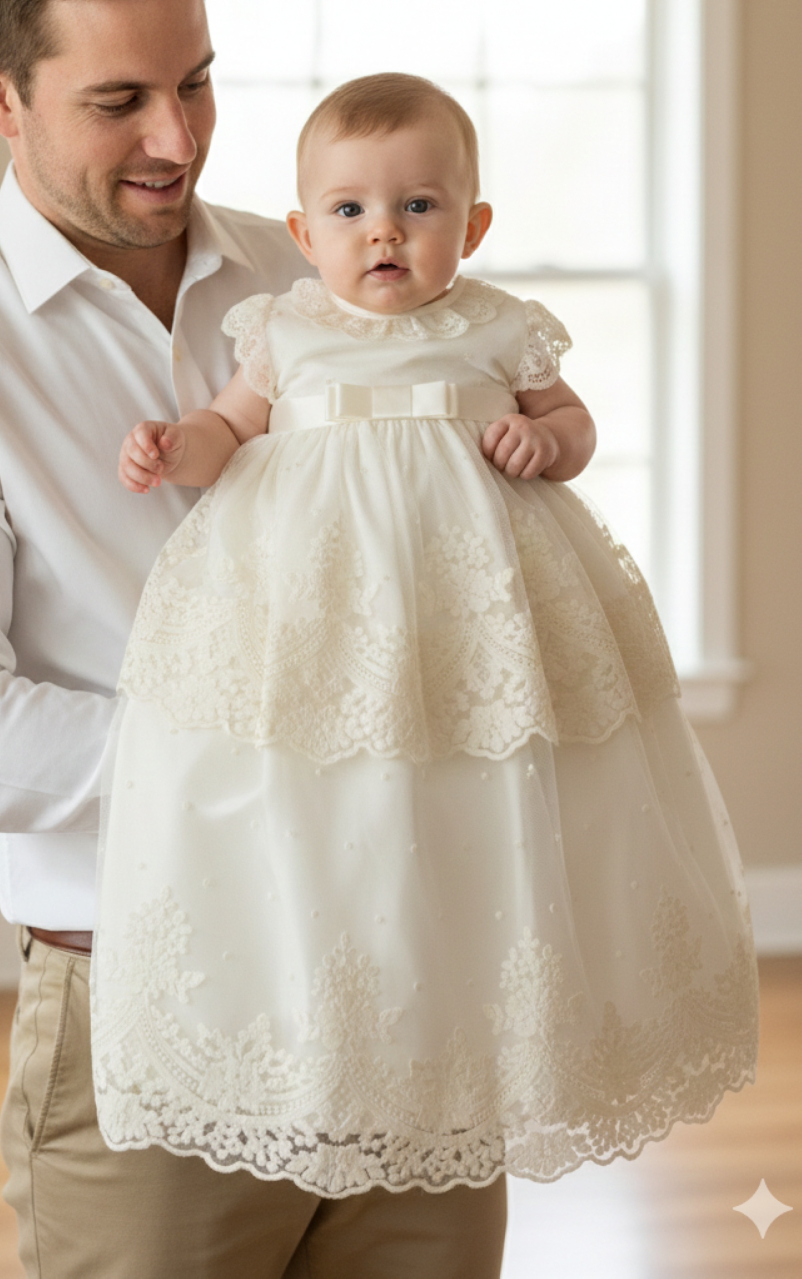 Este faldón largo para Bautizo destaca por su falda amplia con caída ligera y un trabajo de encaje que aporta textura y luz sin recargar. El cuerpo es suave y cómodo, con remates cuidados y un lazo discreto en la cintura que realza el conjunto con elegancia. Ideal como ropa de Bautizo bebé para Ceremonia, fotos, comidas familiares o celebraciones importantes.