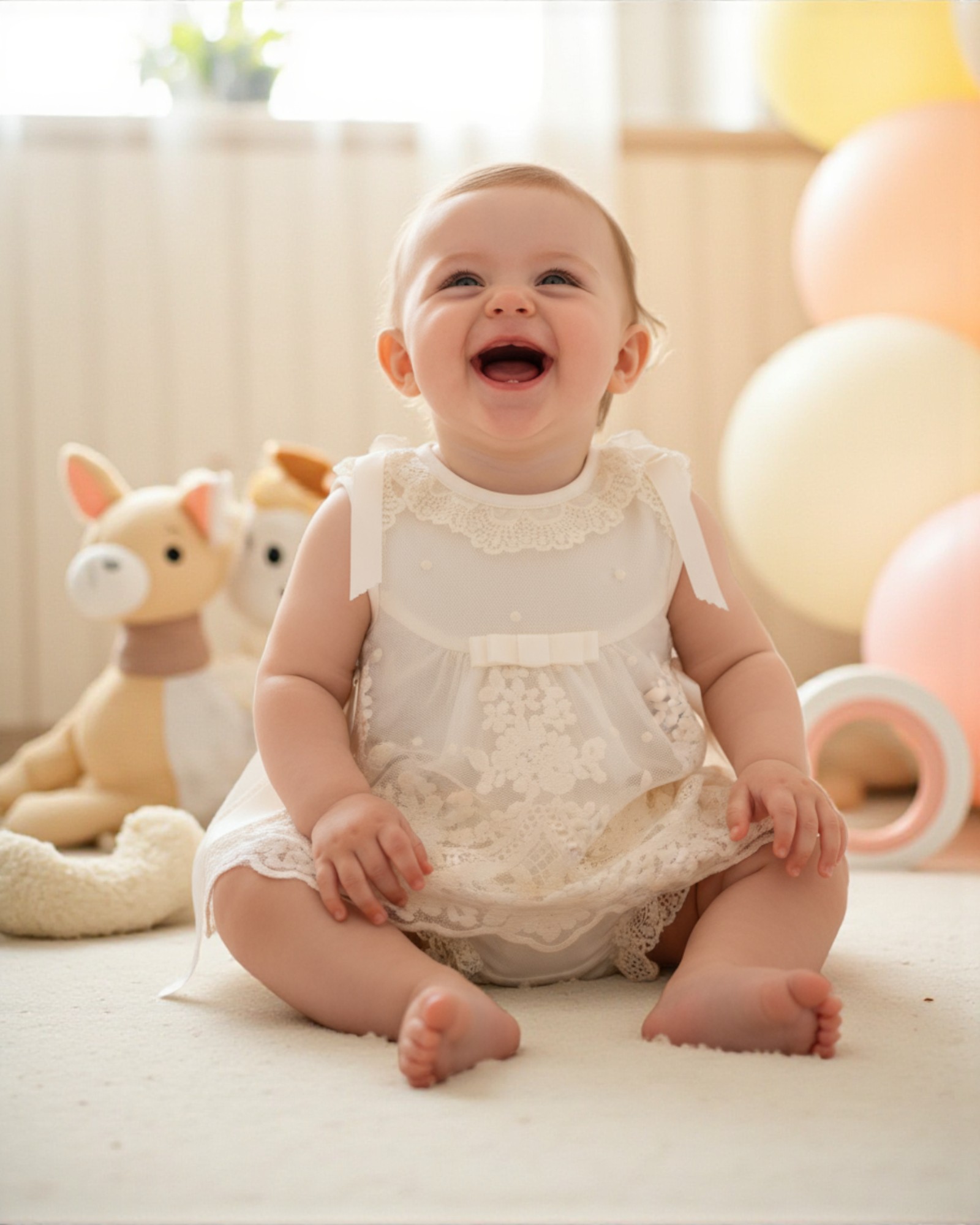 Este conjunto de Bautizo para bebé niña es una joya de la moda de ceremonia infantil más cuidada. Confeccionado en suave tul bordado de color crudo, evoca el encanto atemporal de las ceremonias familiares llenas de emoción. Ideal para Bautizos, reportajes fotográficos,