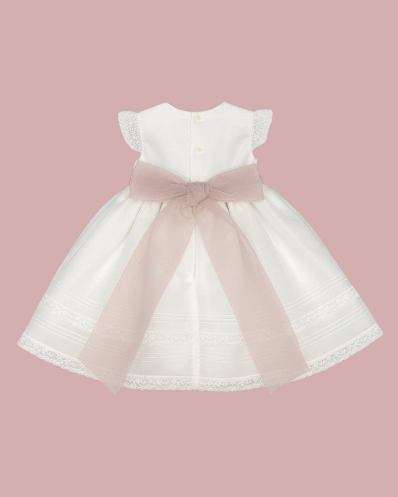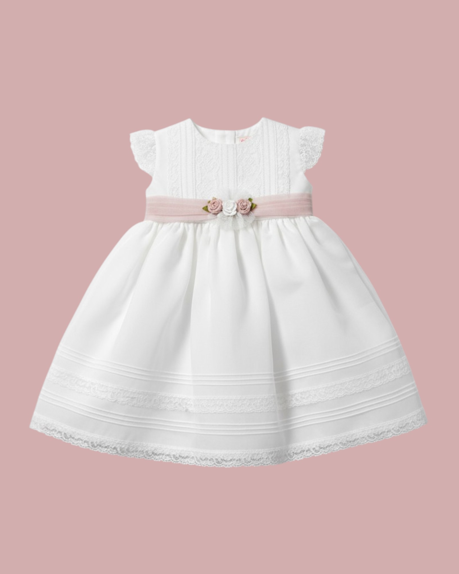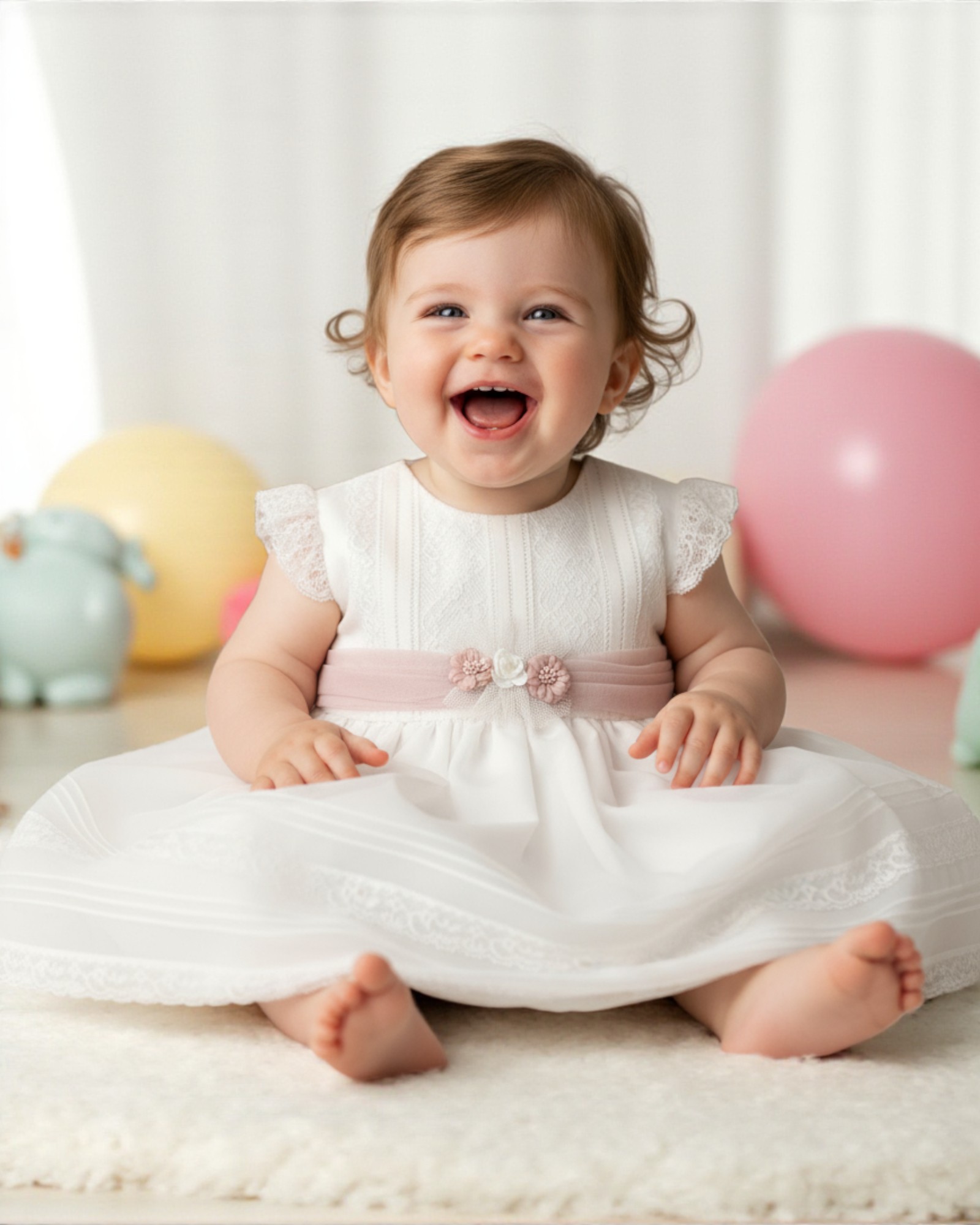 Vestido de Bautizo con fajín rosa empolvado y flores – Pura dulzura para su primer gran recuerdo