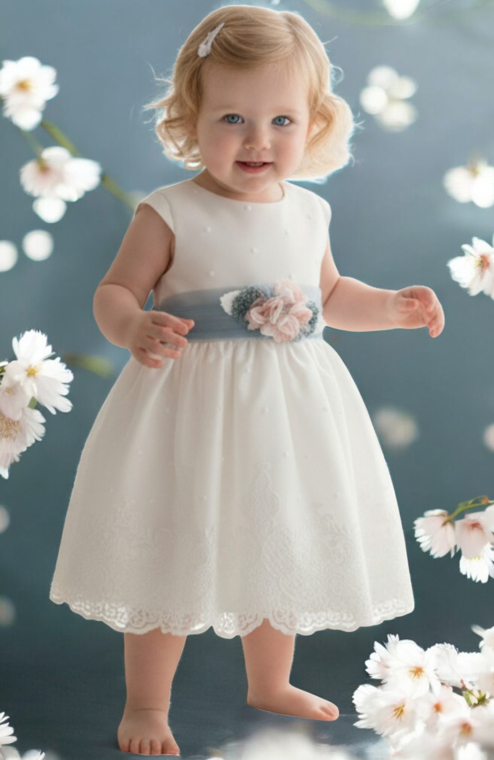 Vestido Bautizo niña bordado fajín azul detalle floral Daniela