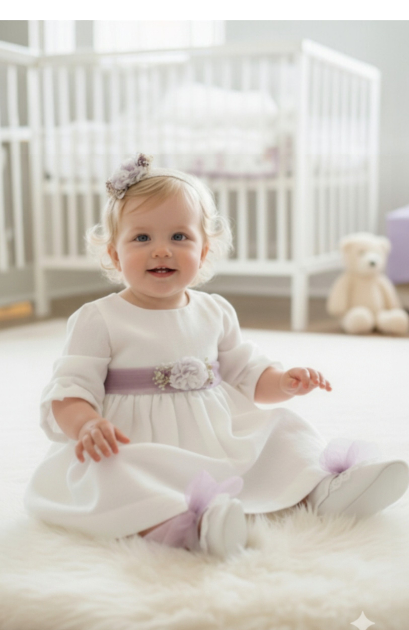Este vestido de bambula destaca por su caída suave y natural, con manga francesa que aporta elegancia y ligereza. El fajín en tono morado envuelve la cintura con un delicado detalle floral artesanal, creando un contraste sutil y lleno de personalidad. Un diseño cuidado al detalle, pensado para bebés que brillan sin esfuerzo.