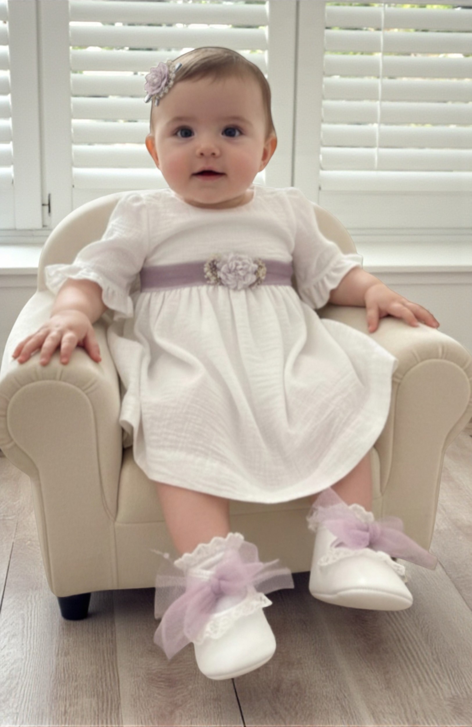Vestido bebé de Ceremonia en bambula con fajín morado. Hay momentos que se recuerdan para siempre.