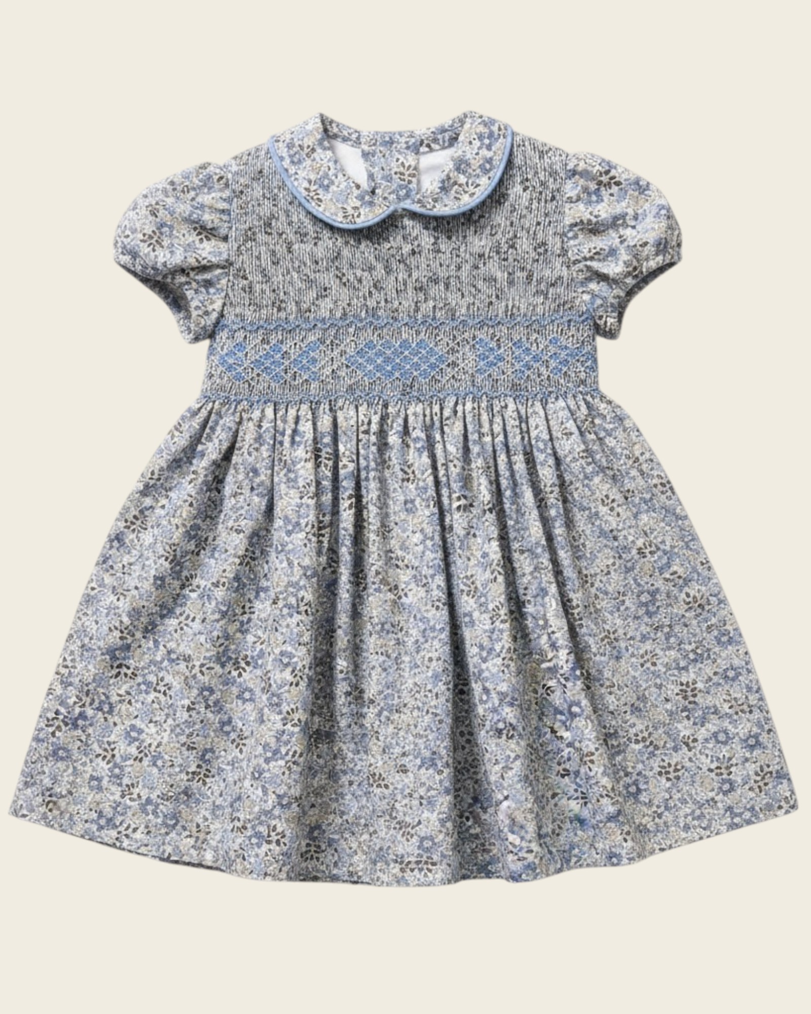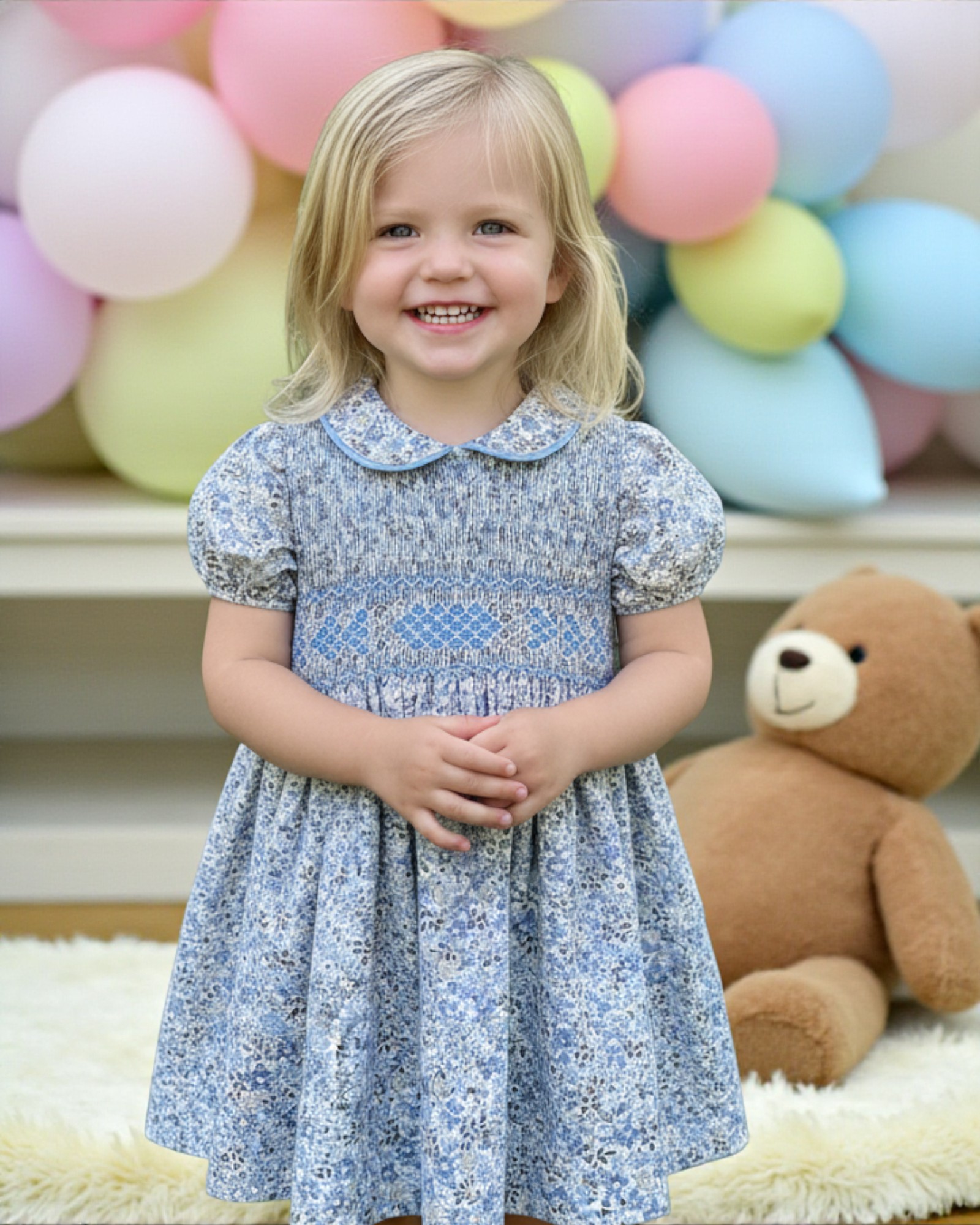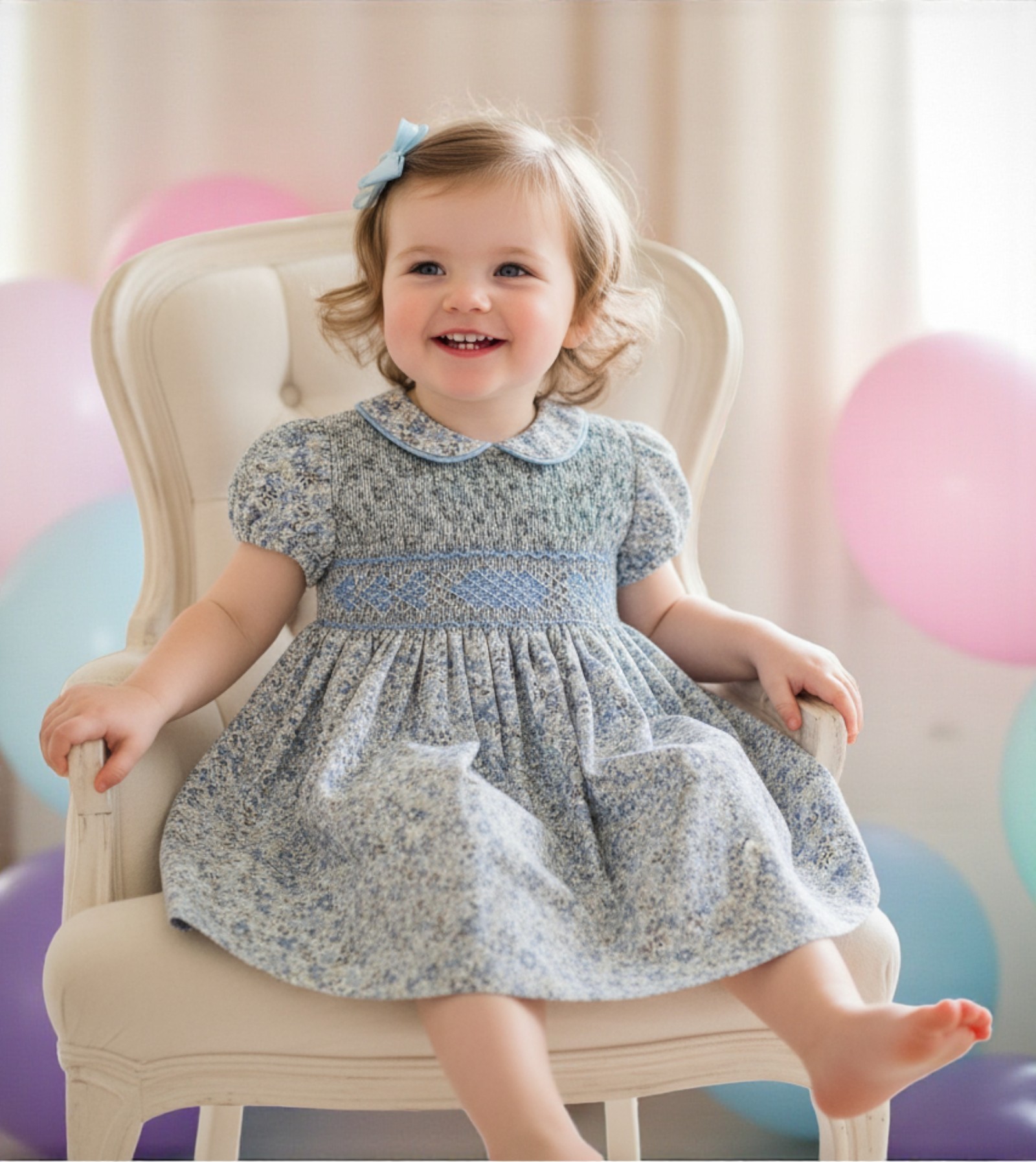 Su diseño clásico, con cuello redondo tipo bebé, manguitas abullonadas y un cuerpo bordado con franjas de nido de abeja en tonos celestes y grises, convierte esta prenda en una pieza única, perfecta tanto para celebraciones familiares, cumpleaños, presentaciones o comidas elegantes, como para paseos de fin de semana donde quieras que tu hija luzca guapa y cómoda.