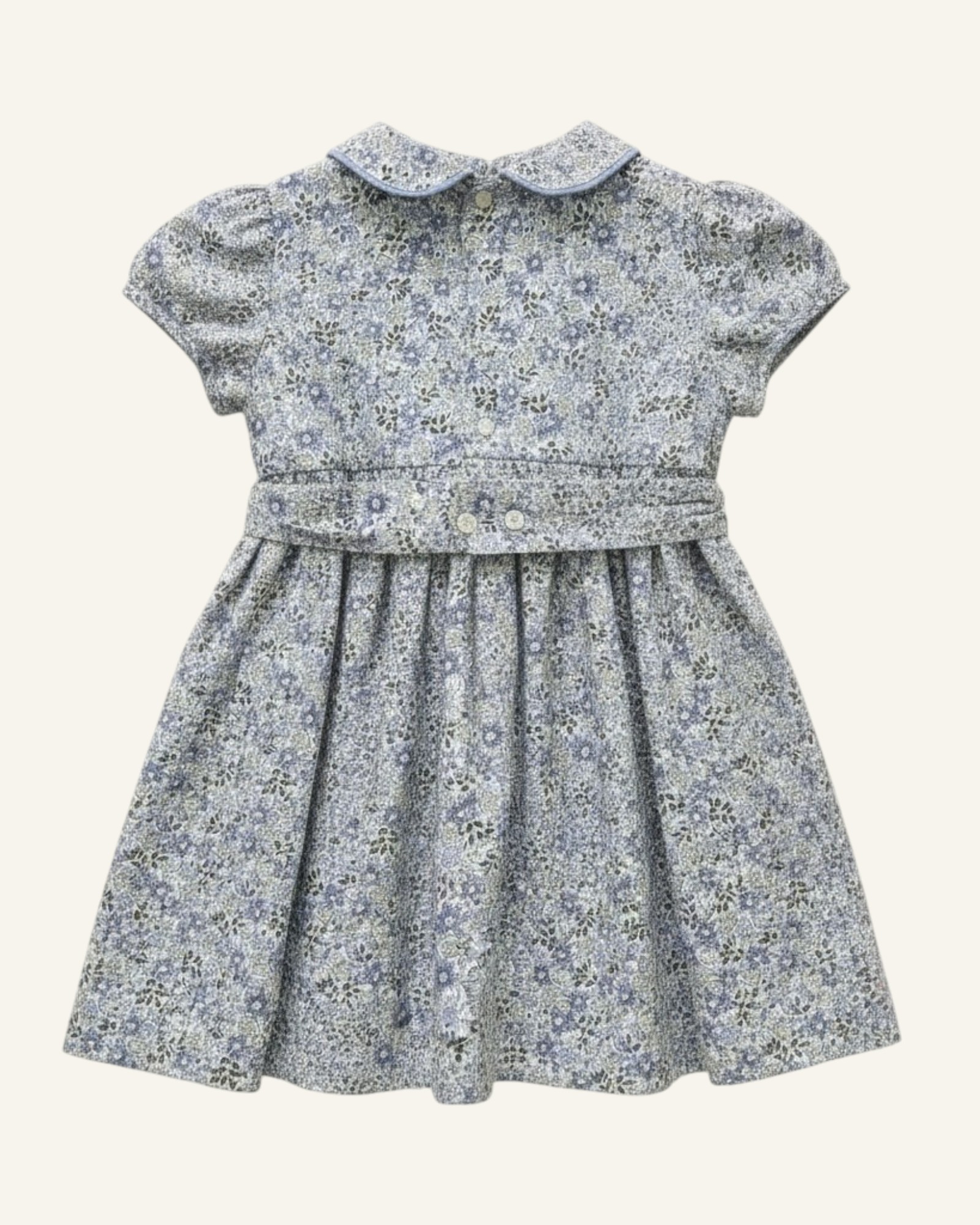 El tejido, con un delicado estampado floral en azul empolvado, aporta frescura y un aire atemporal. La falda amplia y ligera tiene un movimiento encantador, ideal para los primeros giros y juegos, mientras que el interior de algodón garantiza suavidad en contacto con la piel.