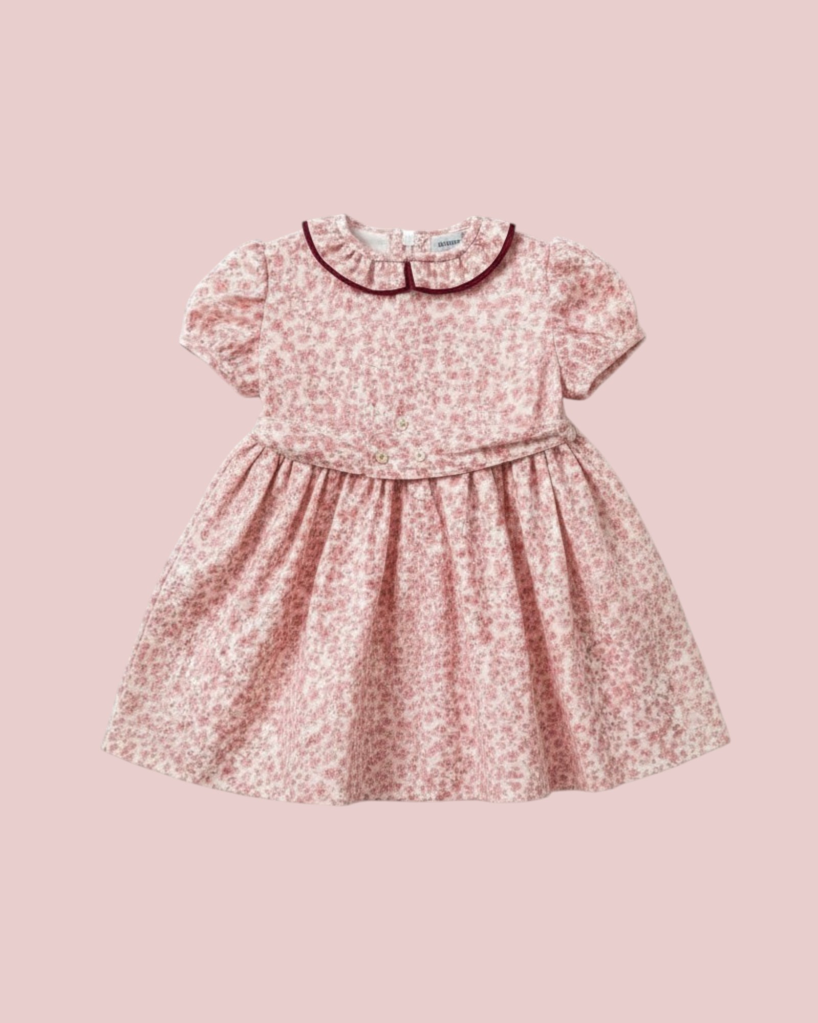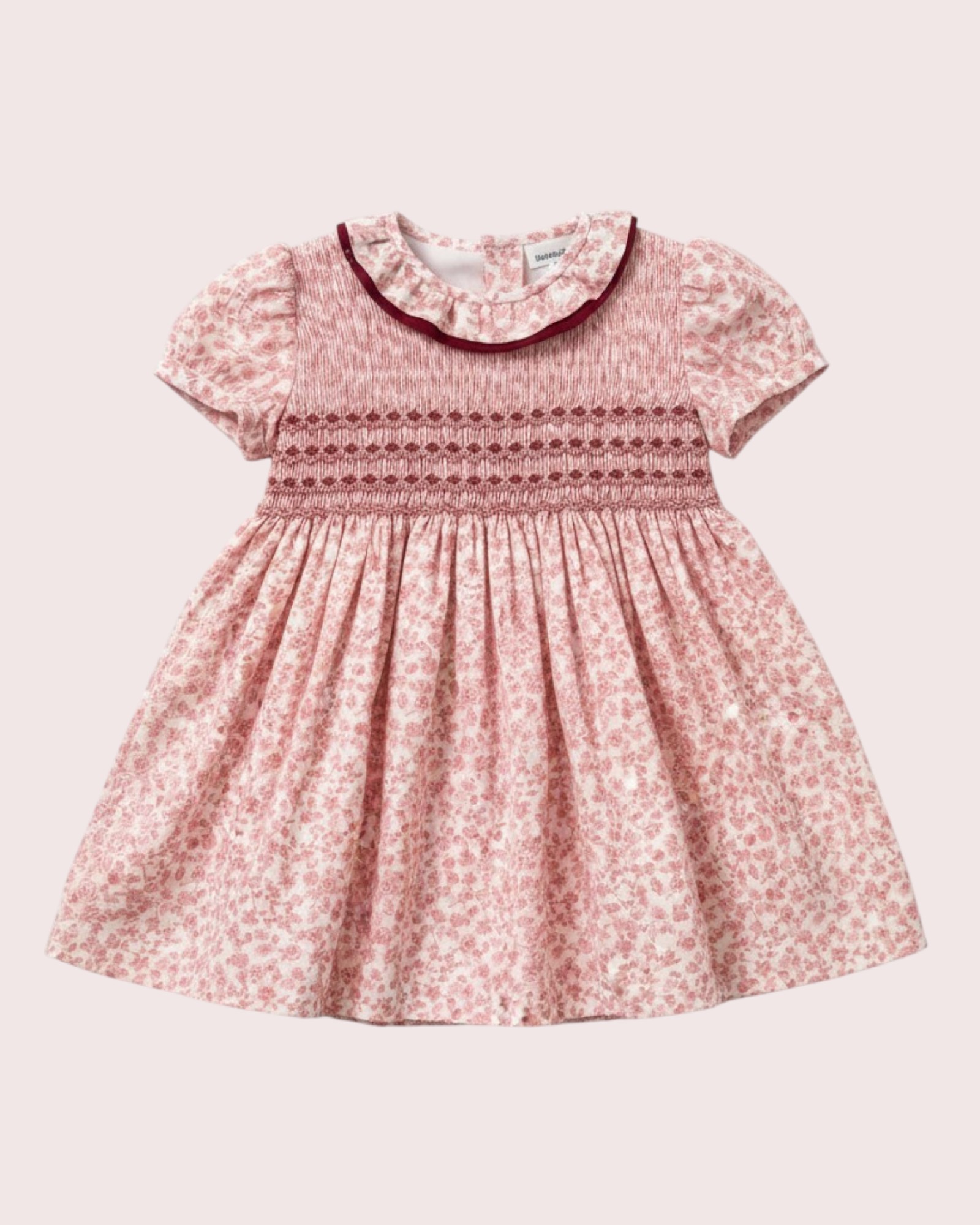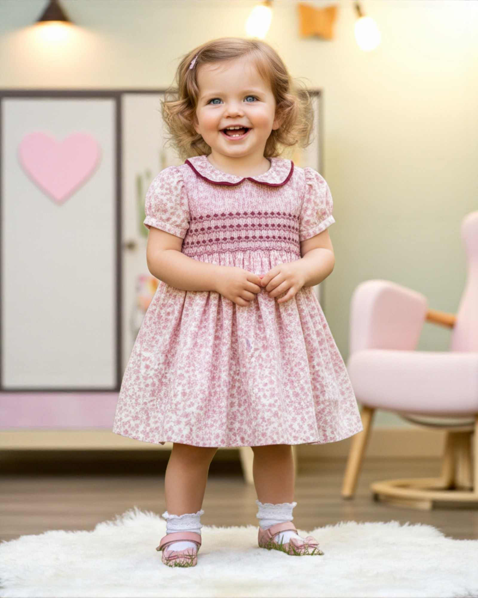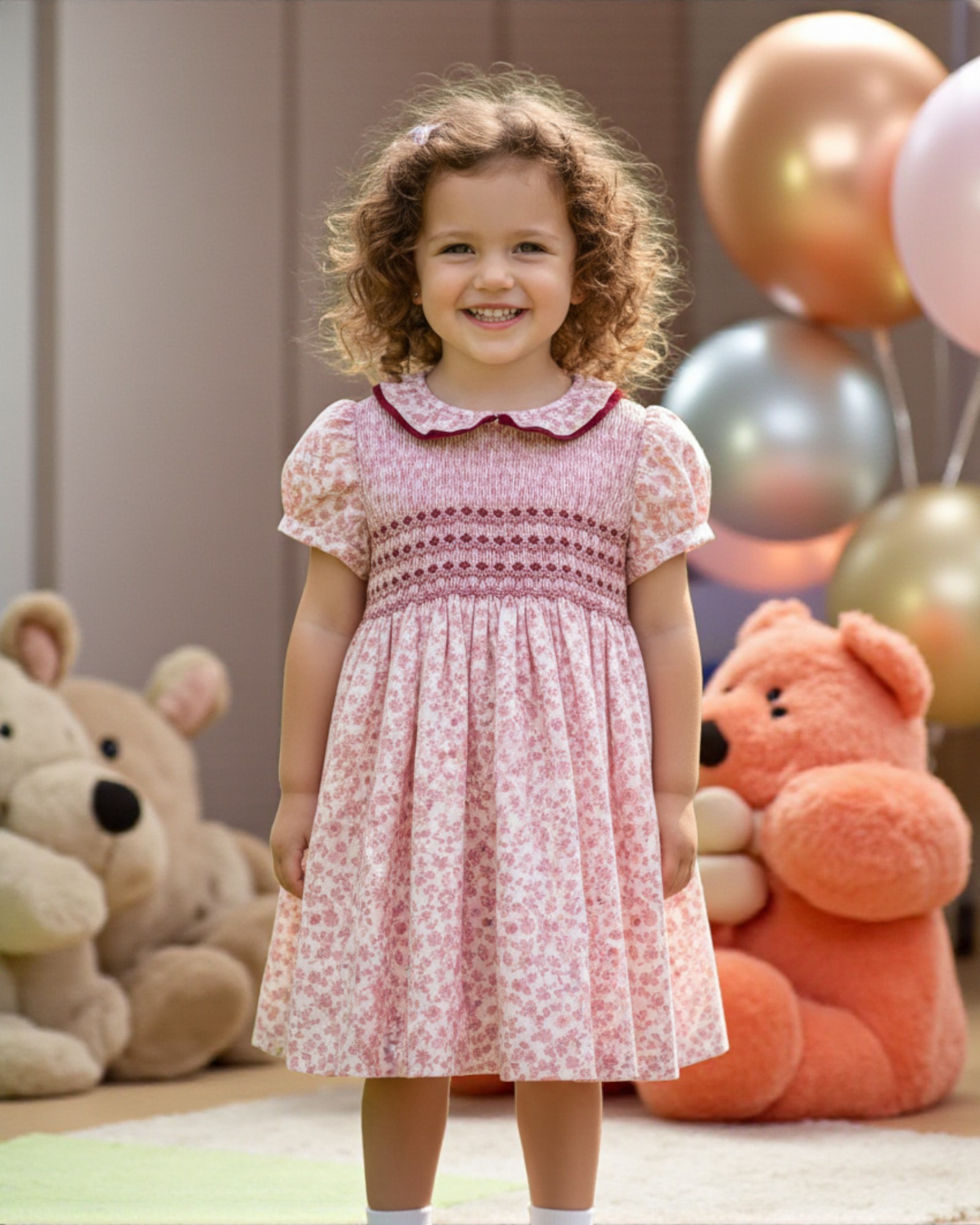 El cuerpo presenta un bordado de nido de abeja artesanal en tonos rosa empolvado y burdeos, acompañado de un cuello bebé redondeado con ribete de terciopelo granate que añade un toque sofisticado. Las manguitas abullonadas y la falda con vuelo generoso en un suave estampado floral evocan la delicadeza de la infancia y el encanto de los vestidos de siempre.