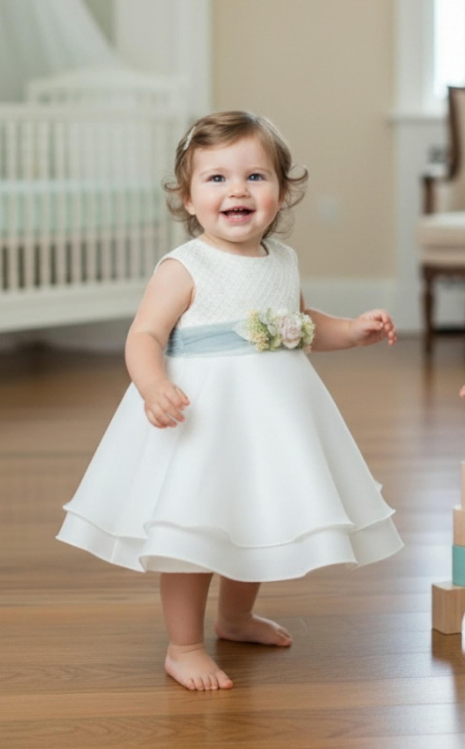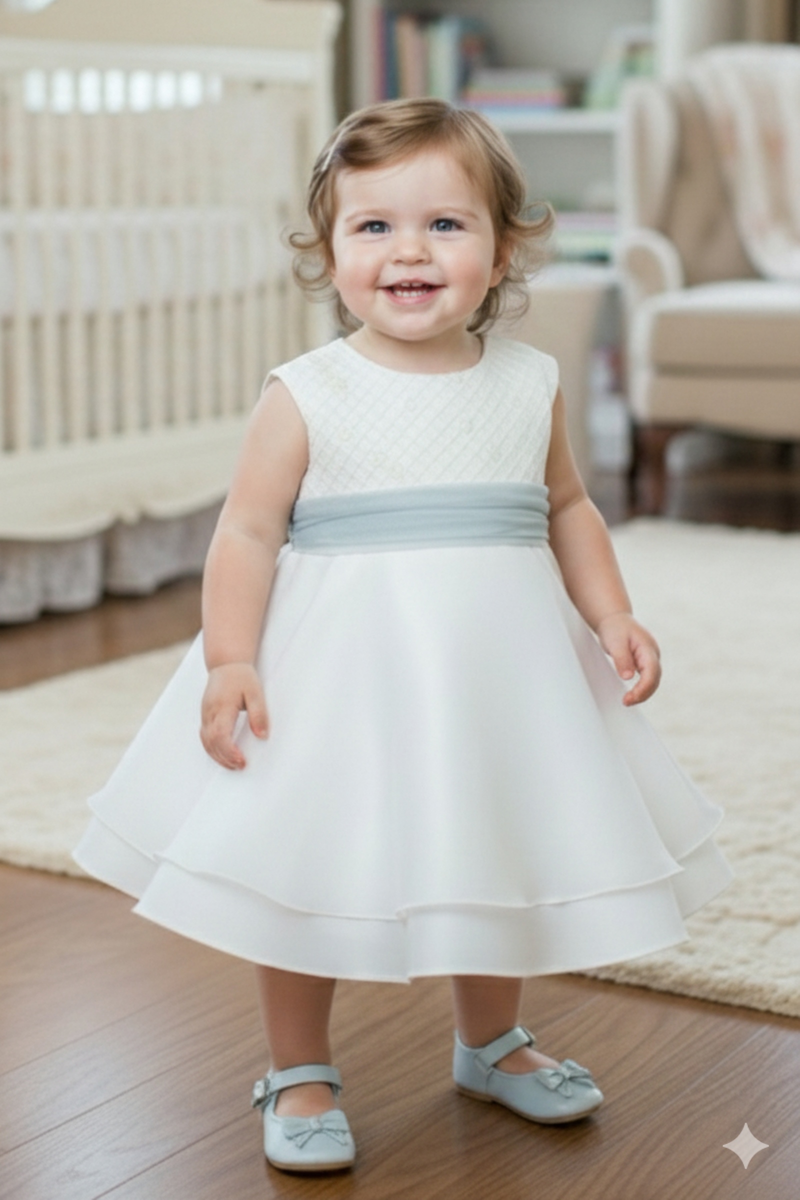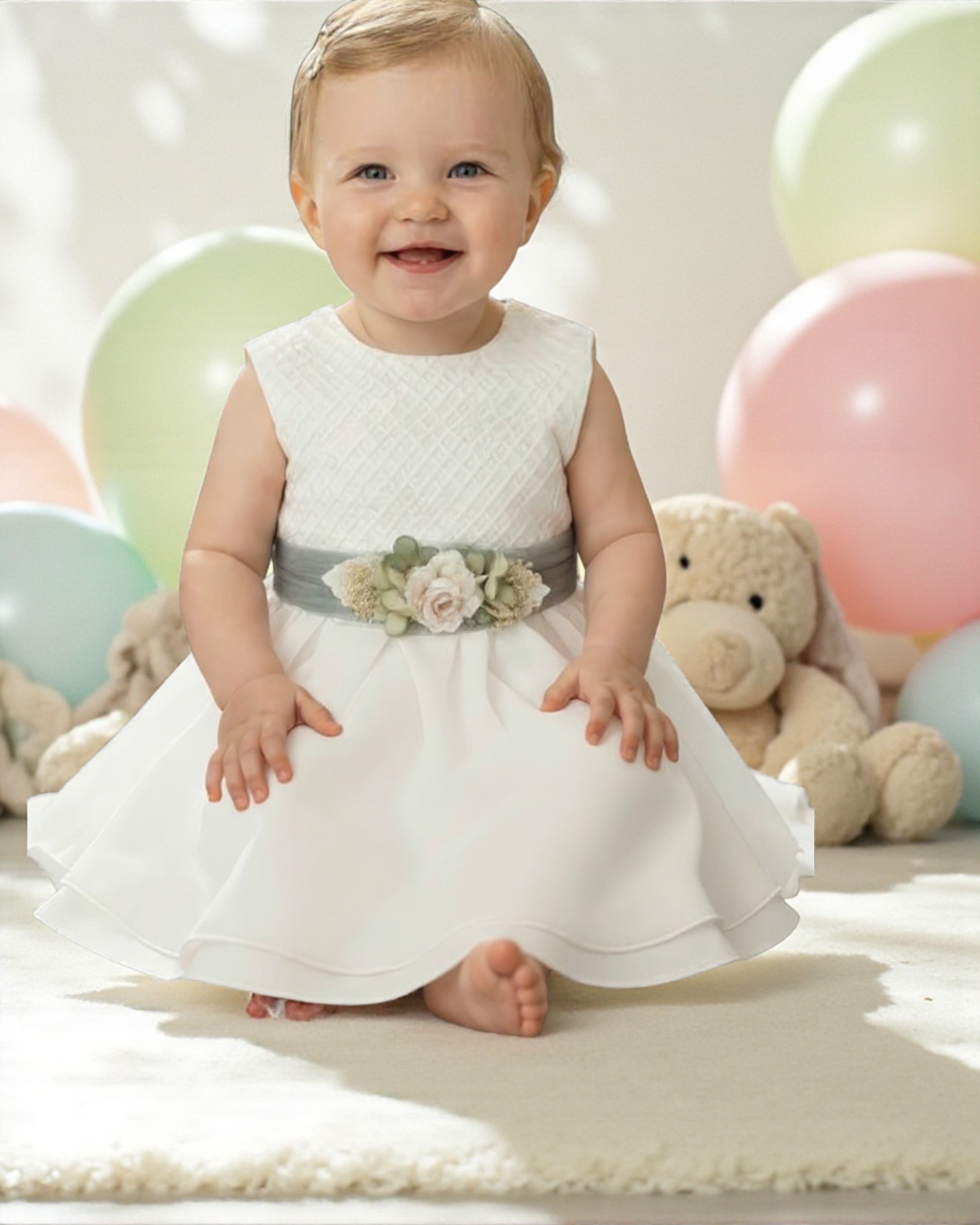 Este vestido de Bautizo para bebé niña combina sofisticación y modernidad en un diseño impecable, pensado para celebraciones con alma. El cuerpo en tejido crudo con bordado de cuadrícula delicada transmite elegancia sutil, mientras que la falda de capa en organza satinada aporta volumen ligero y un movimiento precioso al caminar.