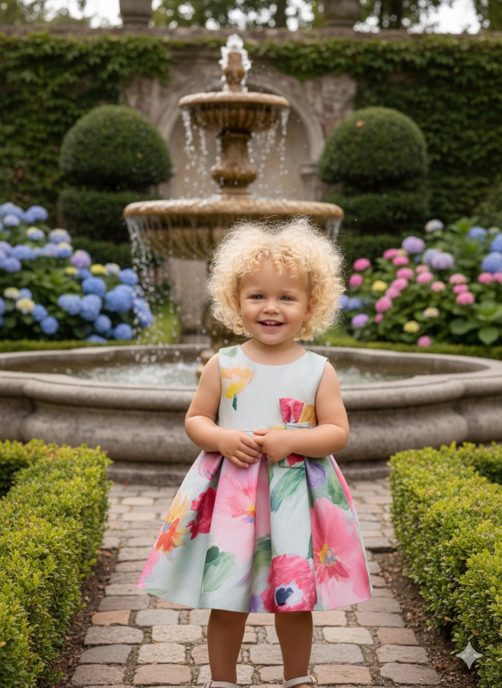 Este vestido estampado para niña destaca por su delicado print floral en tonos suaves, perfecto para Ceremonia, bautizos, cumpleaños, aniversarios o eventos familiares especiales.