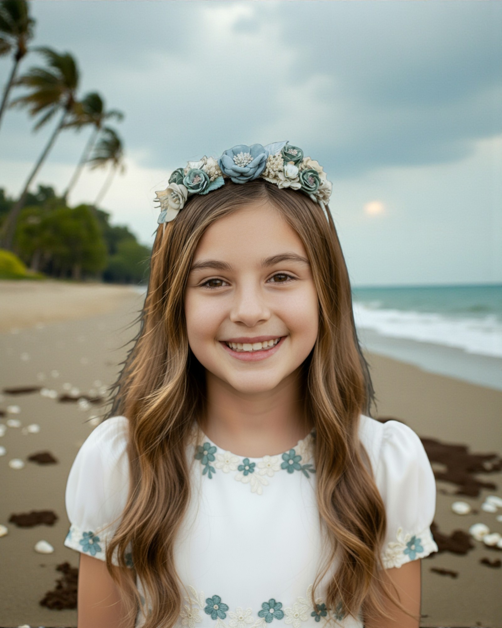Este modelo aporta un estilo romántico y actual que combina con vestidos crudos, verde agua o azules verdosos. Es perfecto para niñas de entre 3 y 10 años que participen en celebraciones familiares o eventos especiales.
