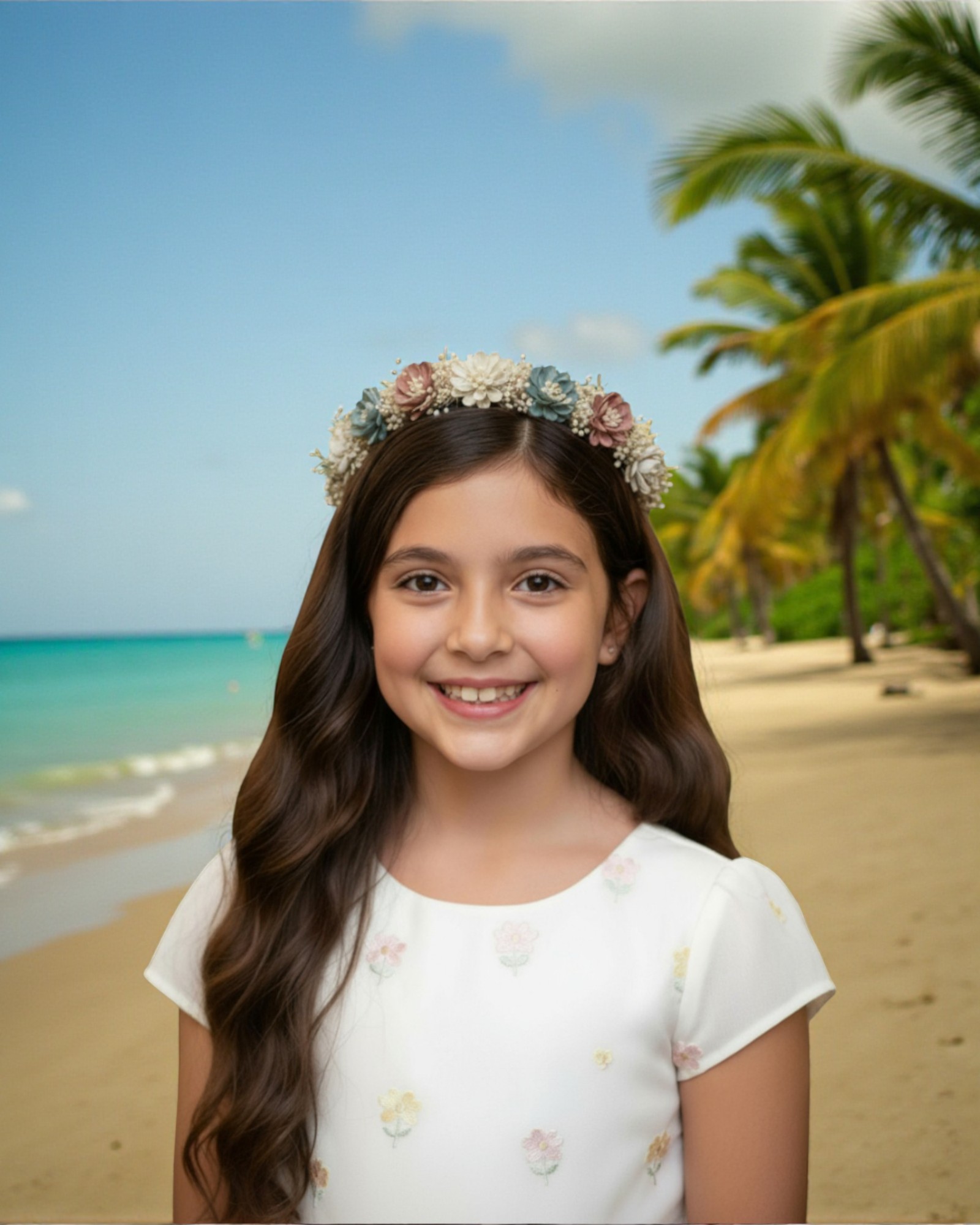 Compuesta por flores artesanales en tonos empolvados como rosa antiguo, verde agua, crudo y teja, se entrelaza sobre una base fina y flexible en tono oliva con pequeños brotes blancos que simulan perlas vegetales. Cada flor aporta un matiz especial, creando un conjunto armonioso, vibrante y natural que realza el rostro de la niña sin recargarlo.