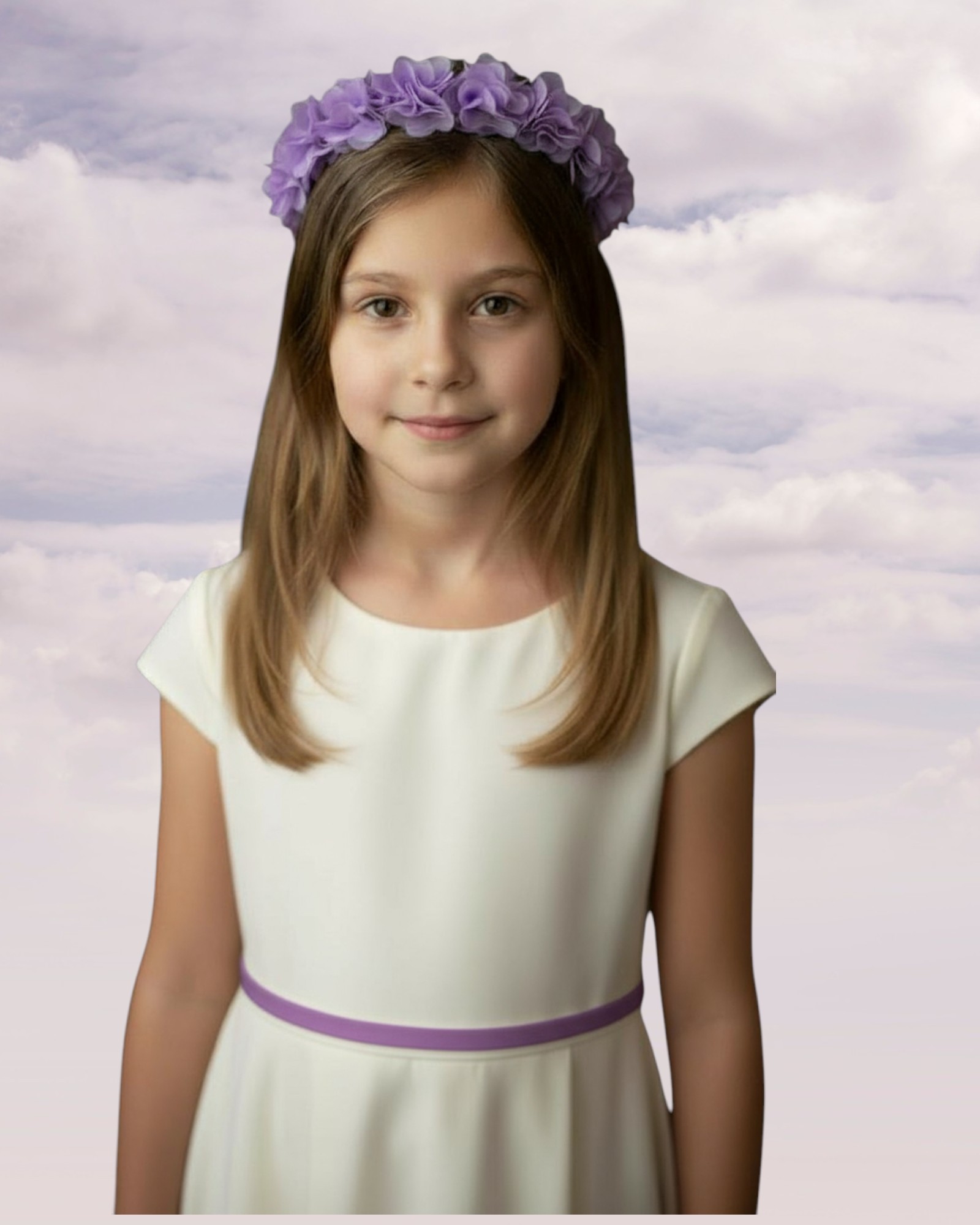 Un gesto, una risa, una corona que enmarca el rostro de tu hija en uno de los días más especiales de su infancia. Esta Corona niña ceremonia pétalos morados es pura dulzura y armonía.