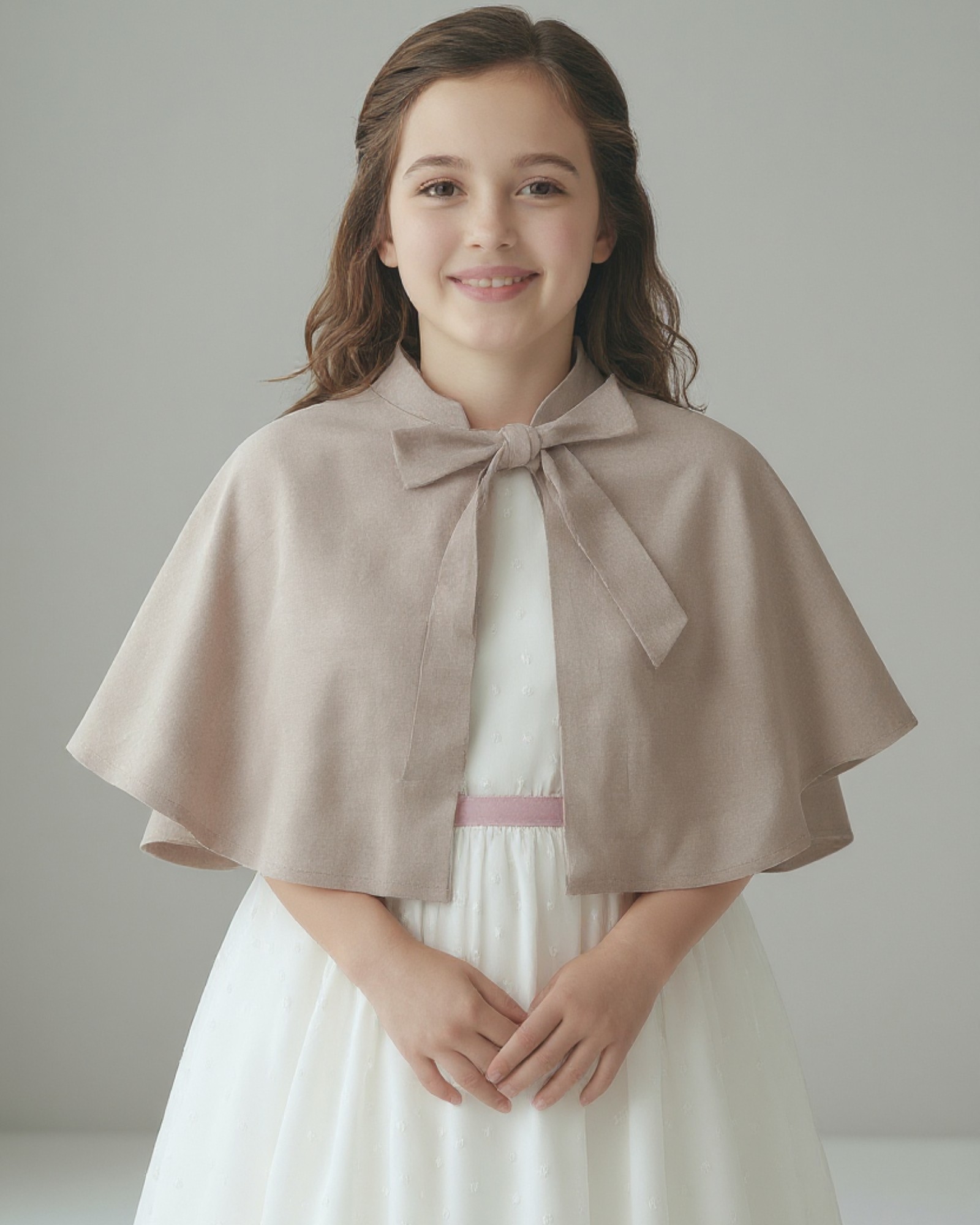 El cierre con lazo al cuello añade un toque dulce y romántico, y su color suave armoniza perfectamente con vestidos en crudo, blanco roto o tonos empolvados. Una prenda versátil y refinada para quienes buscan ropa elegante para niña con personalidad y encanto.