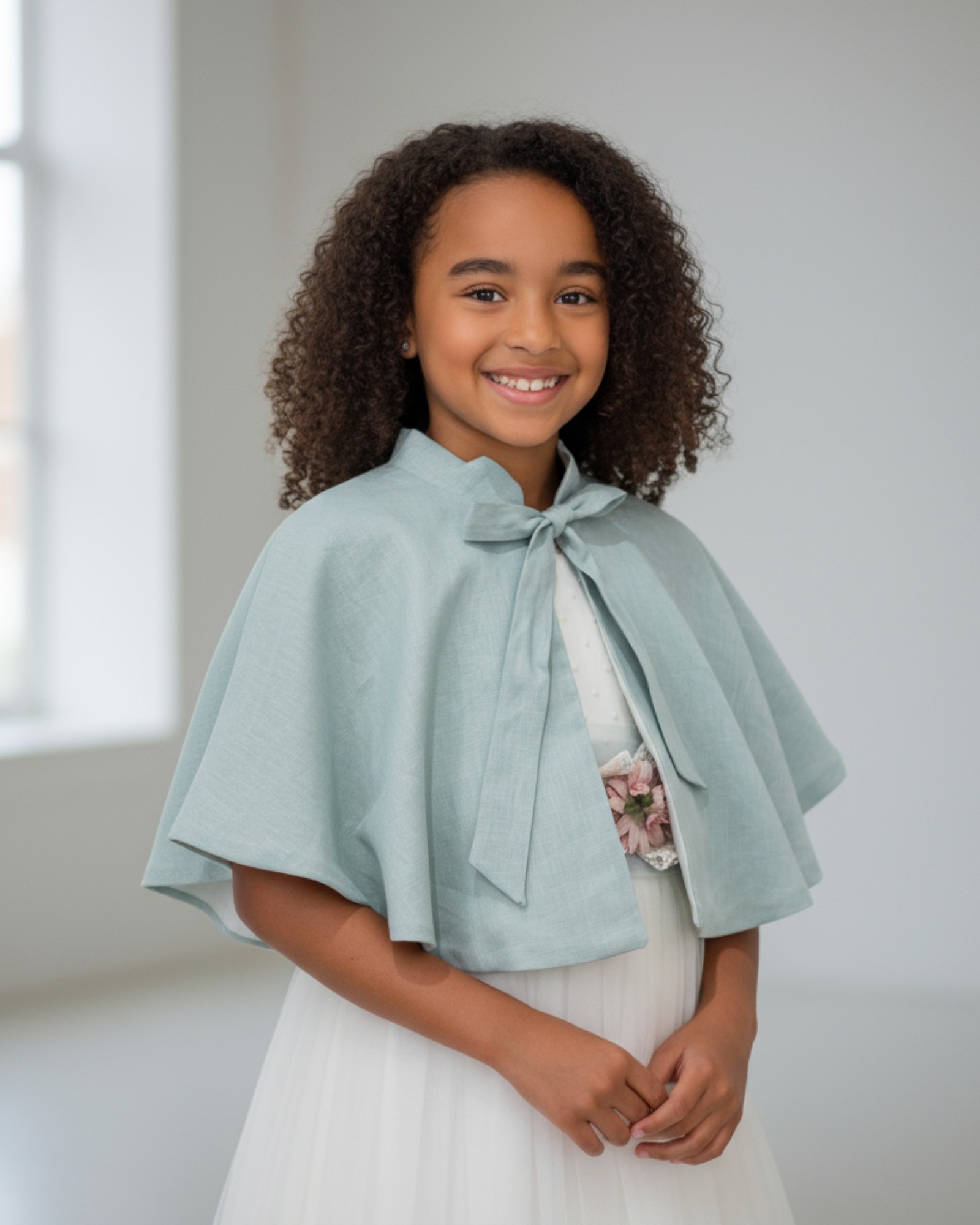 El cierre con lazo al cuello añade un toque romántico y clásico, mientras que su tono verde empolvado combina con facilidad con vestidos en blanco roto, crudo o tonos pastel. Su diseño tipo capa envuelve con suavidad sin recargar el conjunto, adaptándose con comodidad al cuerpo de la niña.
