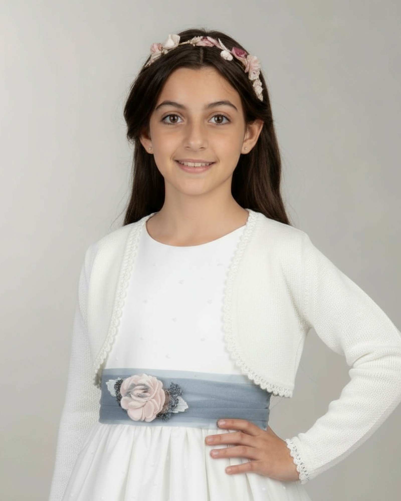 Este bolero de punto fino en color crudo es una prenda imprescindible dentro de la moda de Ceremonia infantil. Su diseño corto y abierto, con remate de puntilla en escote, bajo y puños, aporta un toque romántico y artesanal, perfecto para complementar vestidos de Comunión, Arras o eventos familiares con estilo y discreción.