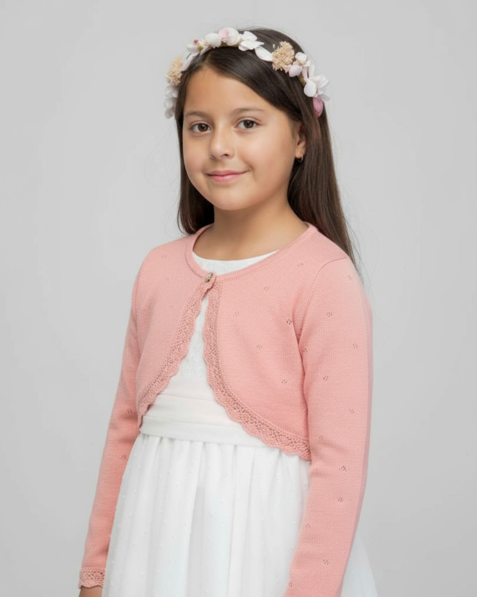 Esta chaqueta tipo bolero de punto fino en tono rosa empolvado es una opción encantadora para completar looks de Ceremonia infantil con elegancia y dulzura. Su diseño cerrado con un delicado botón en forma de flor en el escote, los remates de puntilla en mangas y bajo, y el sutil calado del tejido aportan un aire romántico y refinado, ideal para niñas de entre 5 y 14 años.