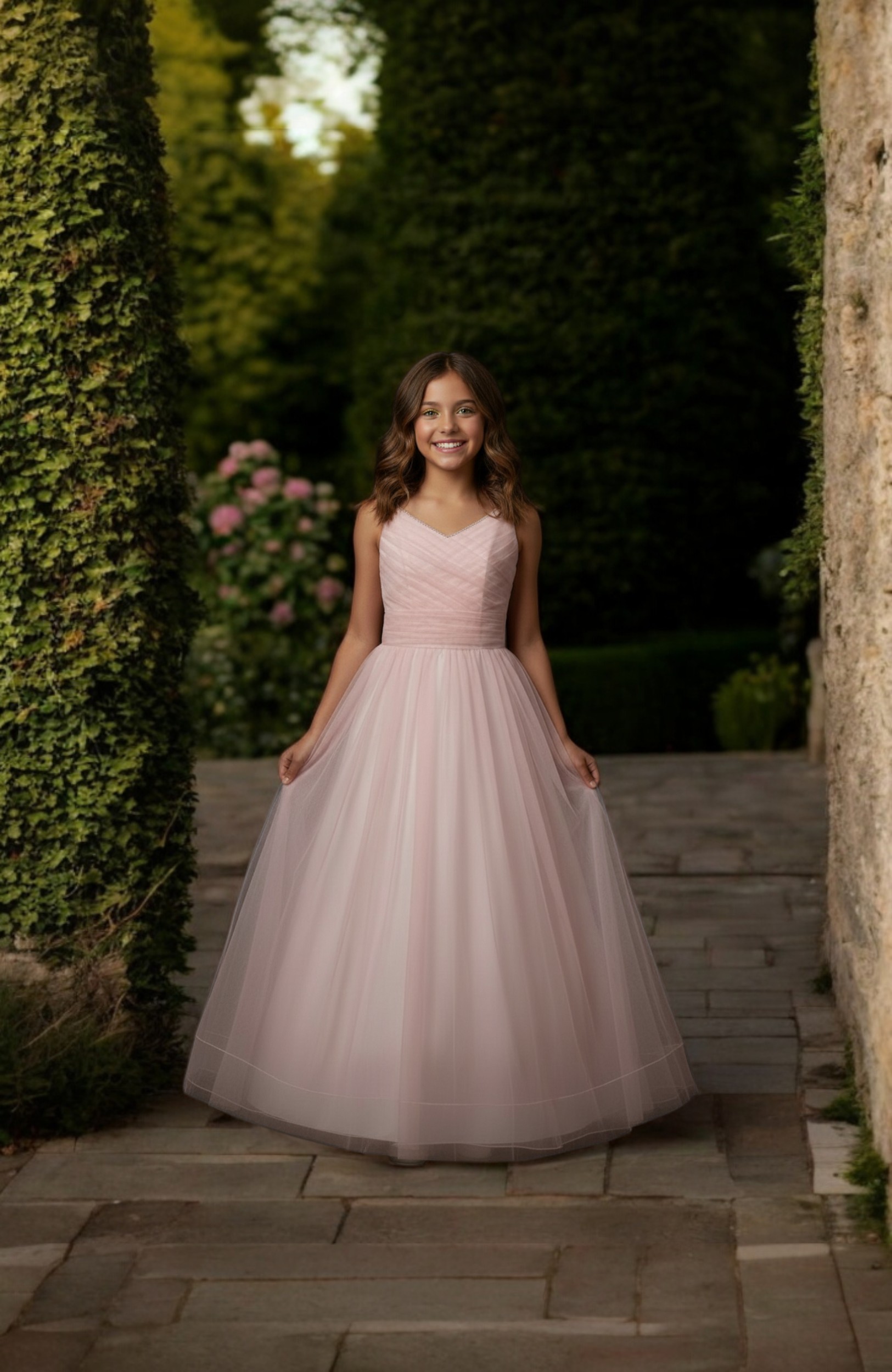 Hay vestidos que convierten cualquier celebración en un momento mágico, y este vestido largo de fiesta para adolescente es uno de ellos. Su tono rosa empolvado, suave y luminoso, envuelve a la joven con una dulzura moderna que transmite seguridad, presencia y una belleza natural que emocionará a toda la familia.