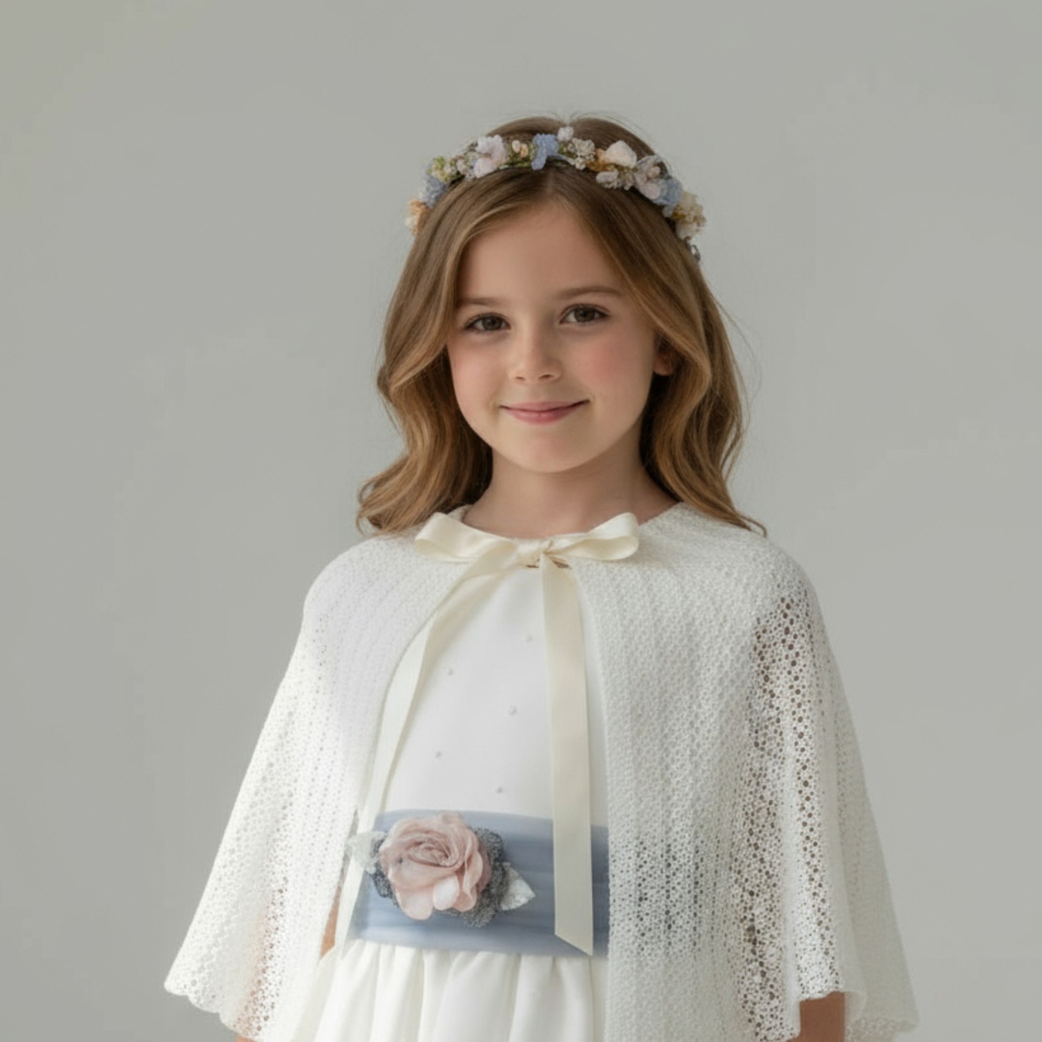Esta capa de niña confeccionada en perlé calado color crudo es una opción encantadora para completar outfits de Comunión, Arras, Bautizo, aniversarios u otras celebraciones familiares con un aire delicado y artesanal. Su tejido ligero y su diseño fluido envuelven con suavidad sin recargar, permitiendo libertad de movimiento y frescura en todo momento.