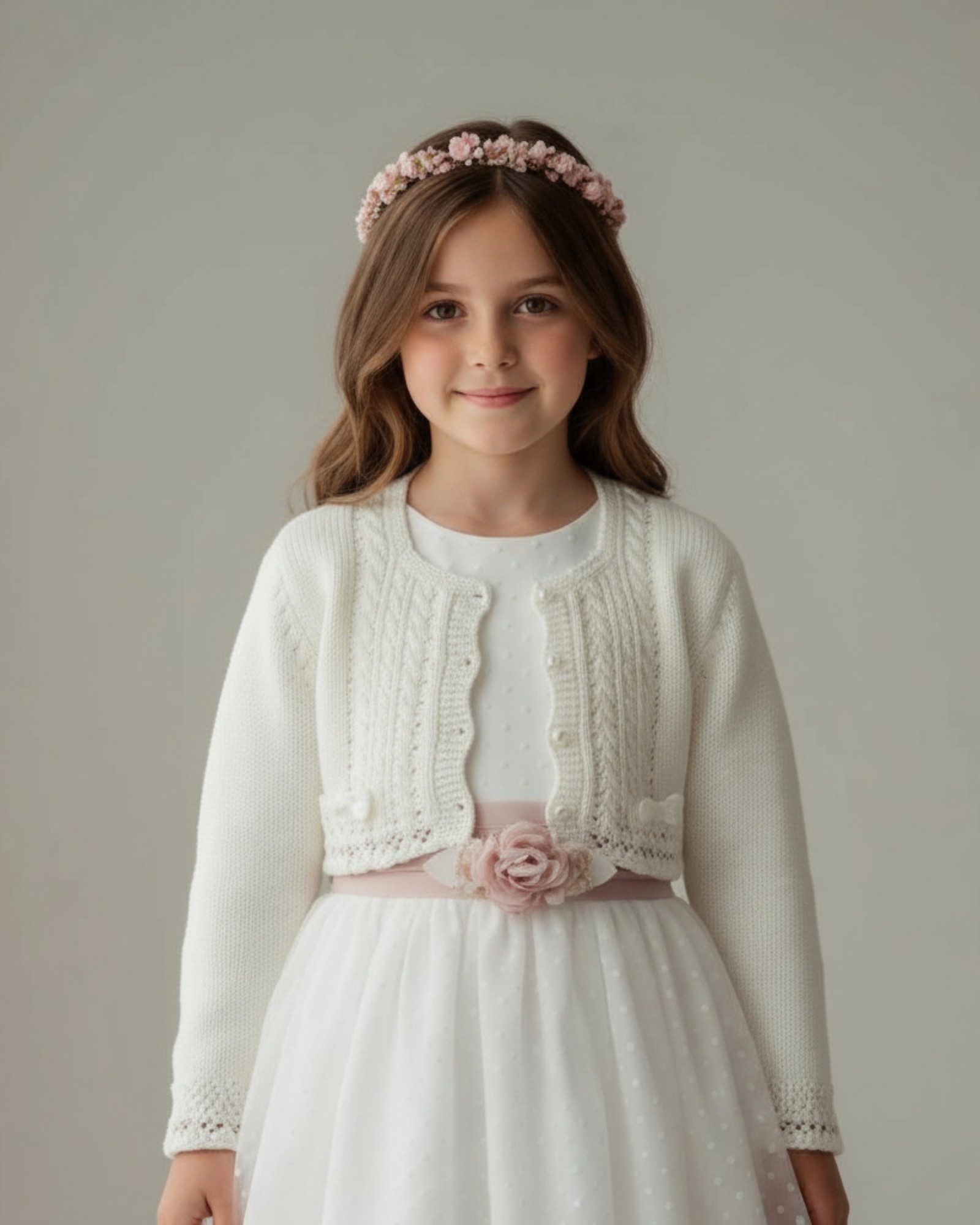 Esta chaqueta de punto en color blanco roto es una joya de la moda de Ceremonia infantil. Su diseño cerrado al frente con botonadura discreta, remates calados y dos pequeños lazos de organza la convierten en una prenda delicada y femenina, ideal para niñas de entre 8 y 14 años que celebran su Comunión o participan en eventos especiales como Arras, Bautizos, aniversarios o celebraciones escolares.