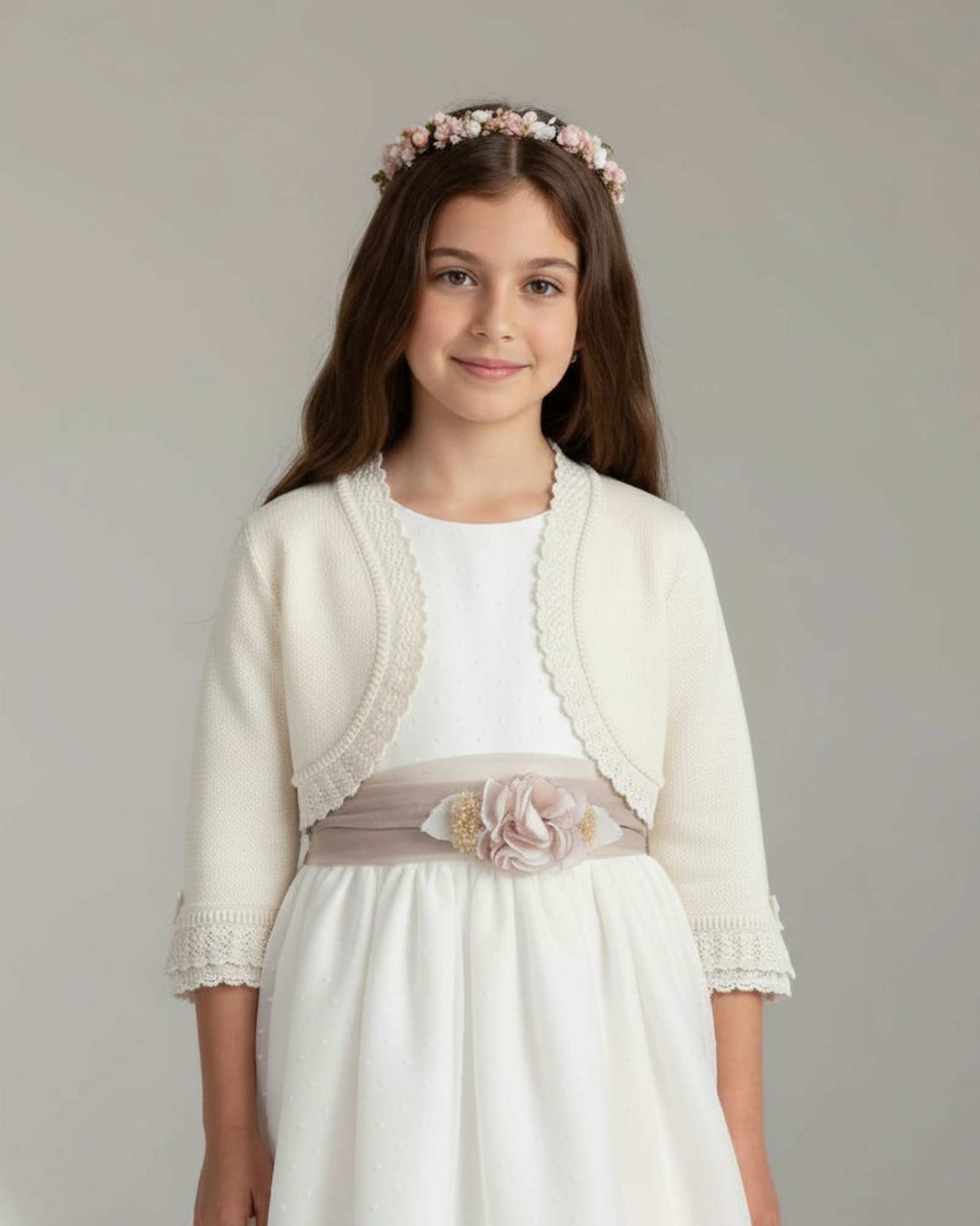 Esta chaqueta de punto en color crudo, con manga francesa y detalles calados, es un imprescindible de la moda de Ceremonia infantil. Su diseño abierto realza con discreta sofisticación vestidos de Comunión, trajes de Arras o conjuntos elegantes para Bautizo, cumpleaños, aniversarios o cualquier celebración especial.
