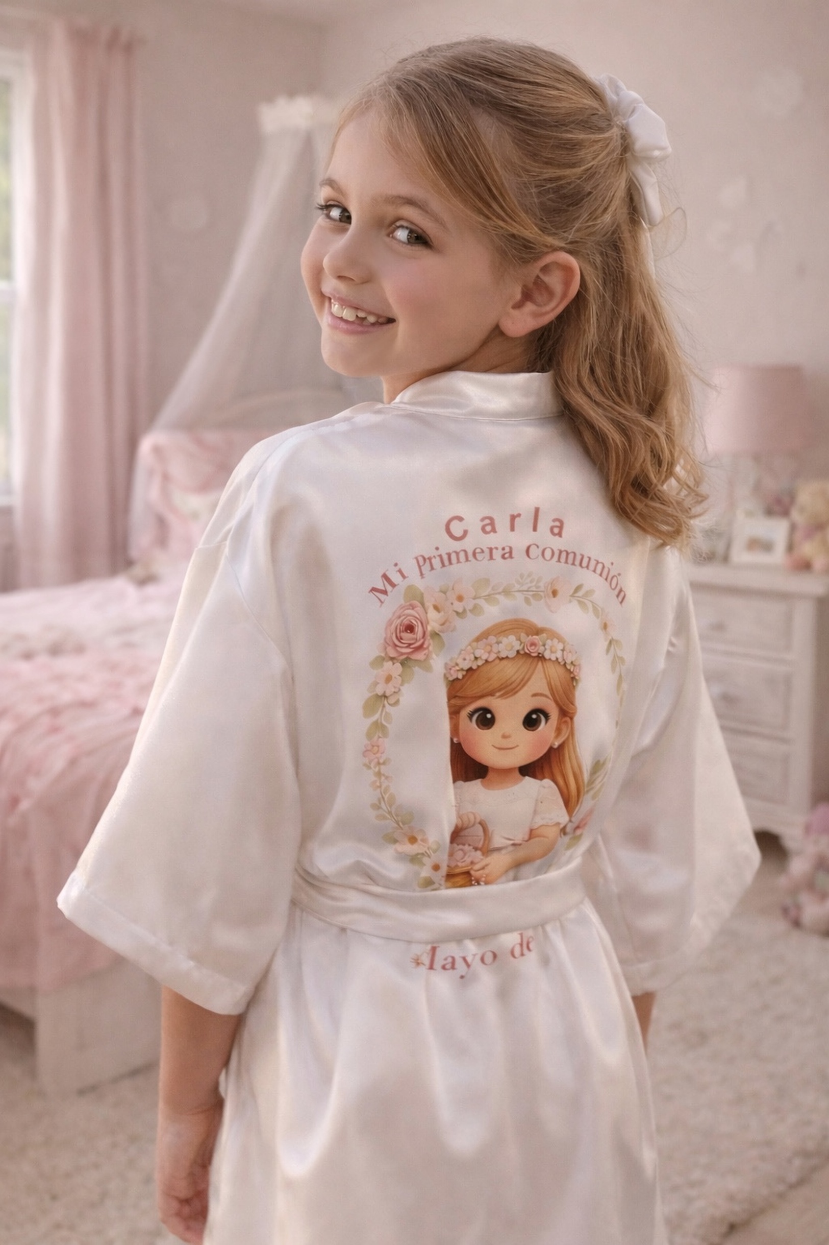 Confeccionada en un suave raso de acabado luminoso, su caída elegante envuelve a la niña en un momento íntimo y mágico antes de vestirse… y también después, cuando todo ha pasado y solo quedan los recuerdos.