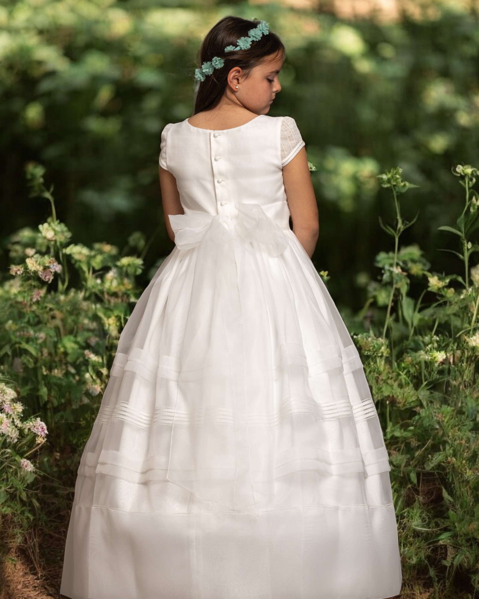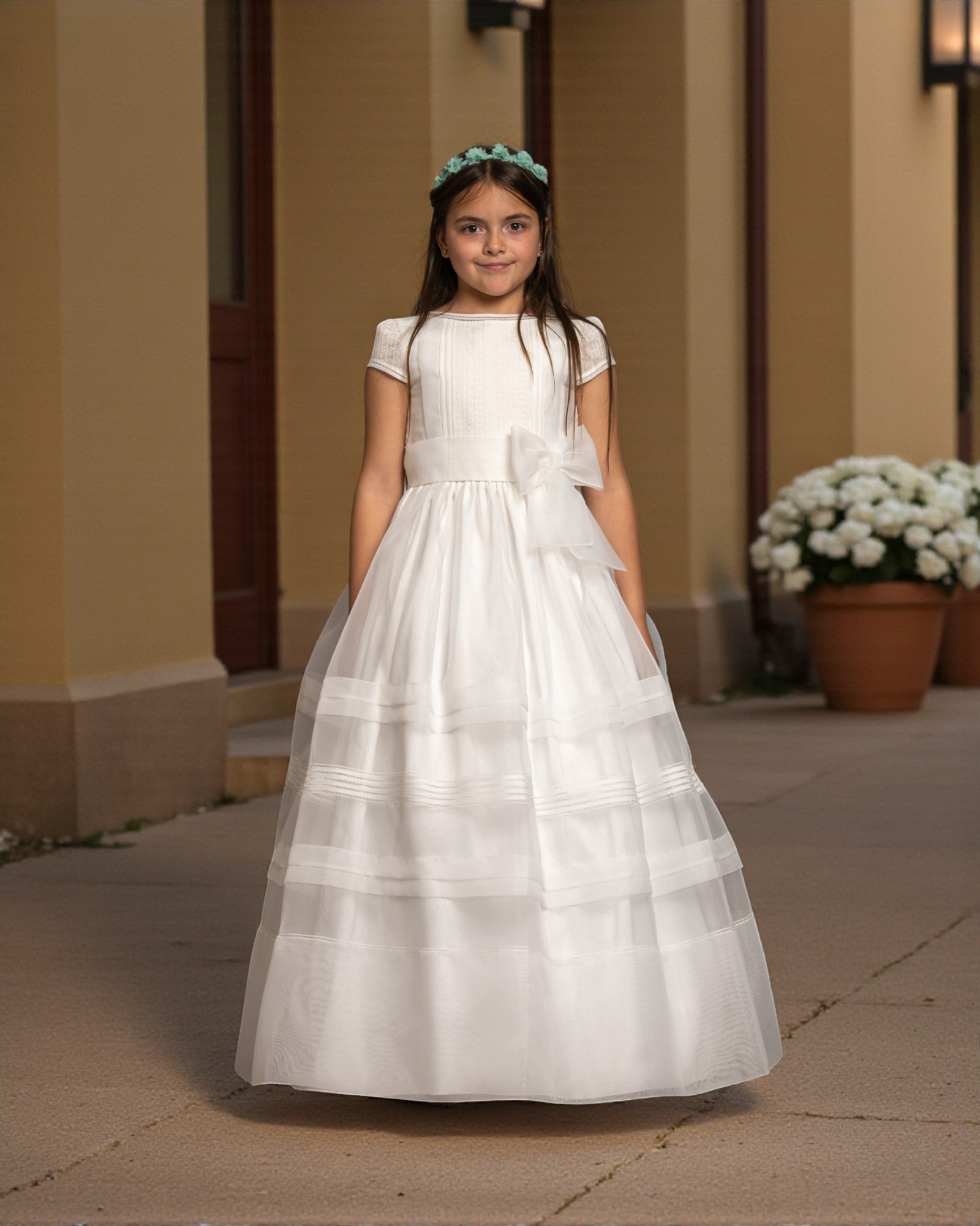 Esta vestido de Comunión niña clásico de jaretas representa la esencia de la elegancia atemporal. Un modelo sobrio y emotivo, ideal para quienes buscan un estilo clásico y limpio en una celebración que quedará grabada en la memoria familiar.