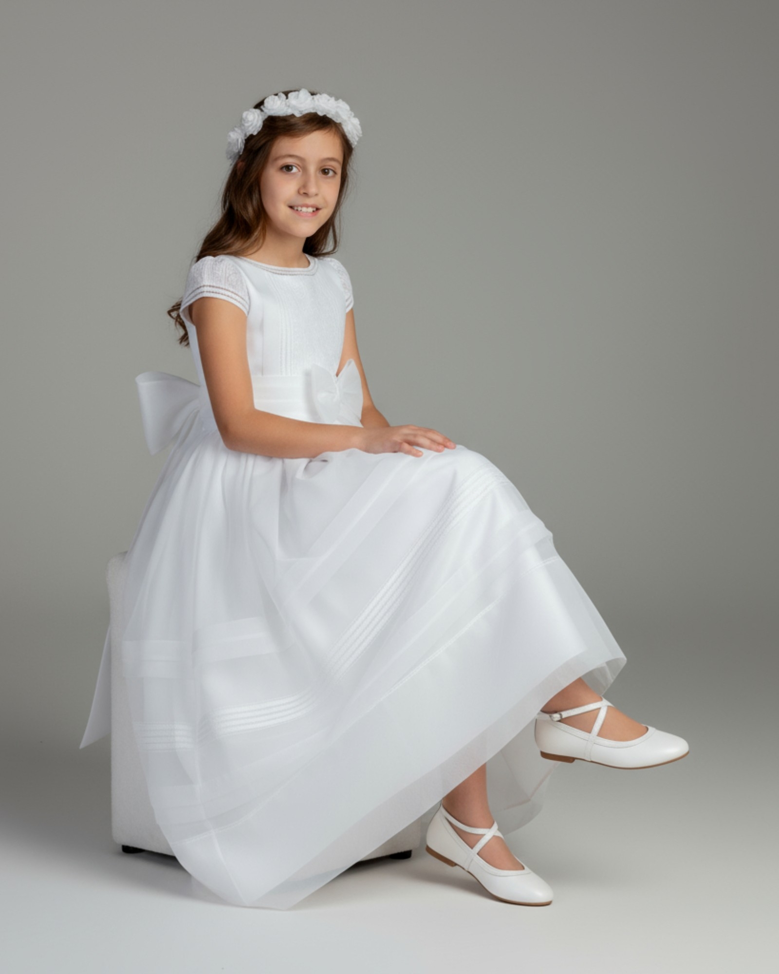 Su tono blanco puro combina impecablemente con cualquier vestido de Comunión, aportando luz, elegancia y un acabado impecable al conjunto. Además, su estilo atemporal hace que este modelo pueda seguir utilizándose después en otros eventos especiales o ceremonias.
