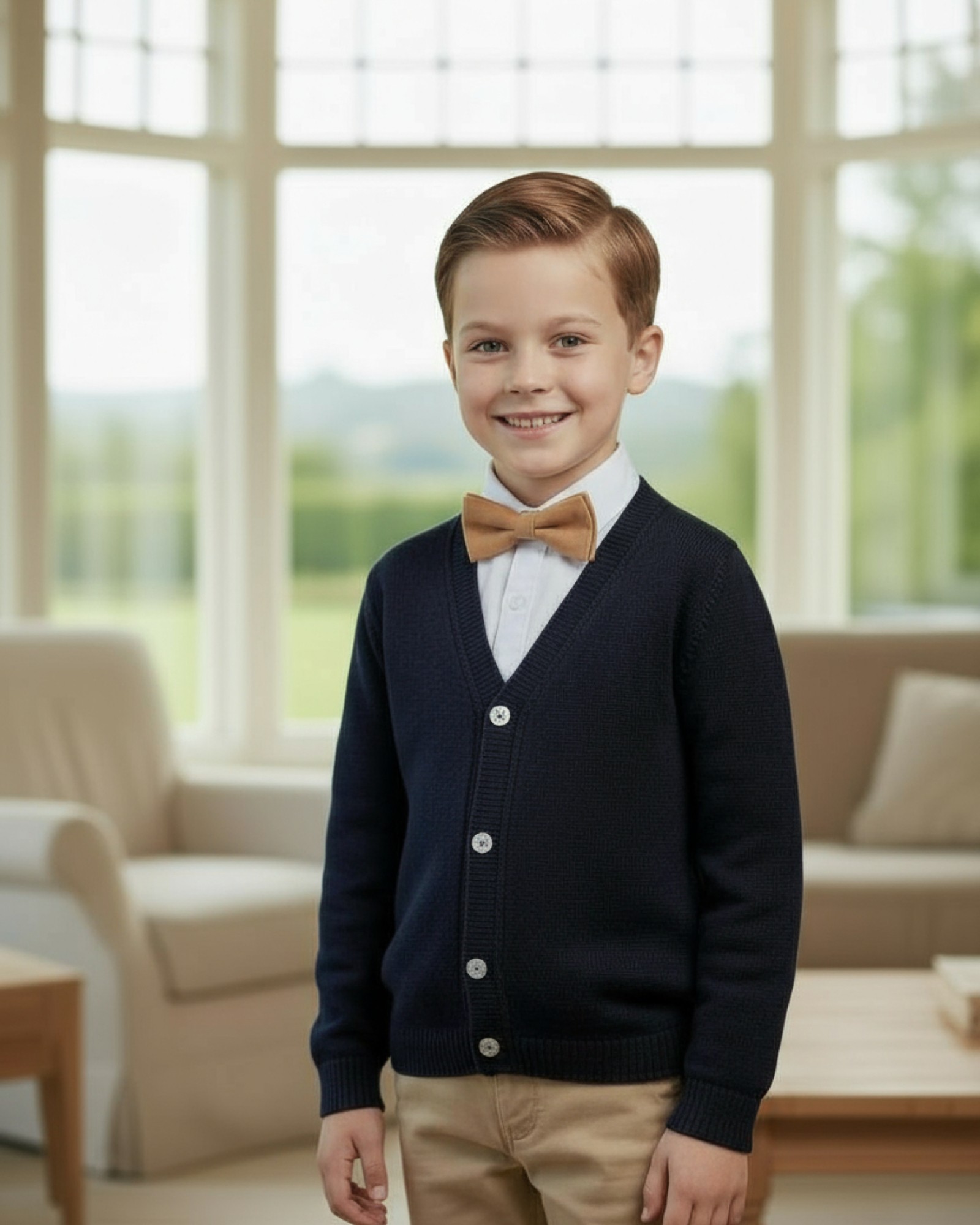 Esta chaqueta de punto fino azul marino es ese comodín imprescindible en el armario de cualquier niño. Con su diseño clásico de cuello pico y botones perlados, combina a la perfección con camisas, pantalones de vestir o trajes de ceremonia. Su tejido es suave, transpirable y cómodo, ideal para llevar tanto en interiores como en exteriores.