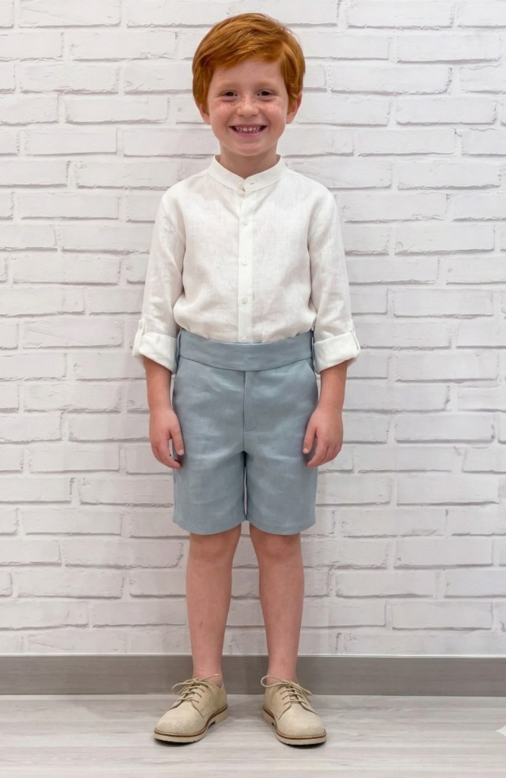 La camisa cruda de lino 100%, con cuello mao y manga larga remangable, aporta un toque suave y armonioso, que contrasta con el pantalón corto en azul océano, un tono vibrante y sofisticado que favorece a todos los tonos de piel.