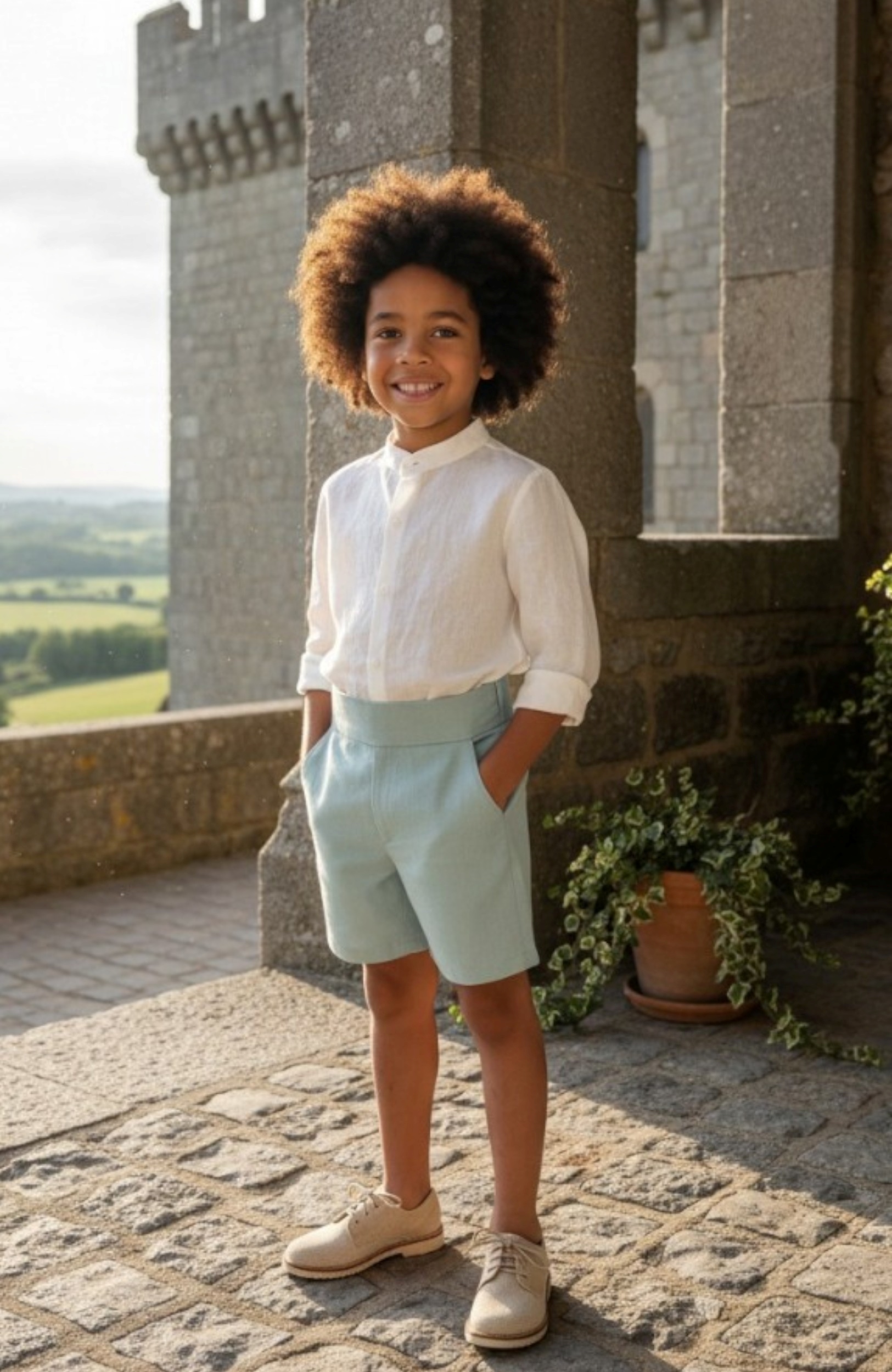 La camisa de ceremonia con cuello mao en color crudo, suave al tacto y ligera, se combina con un pantalón corto en verde agua con fajín integrado que estiliza y aporta un toque delicado. El resultado es un look infantil de ceremonia sencillo pero rotundo, con identidad propia.