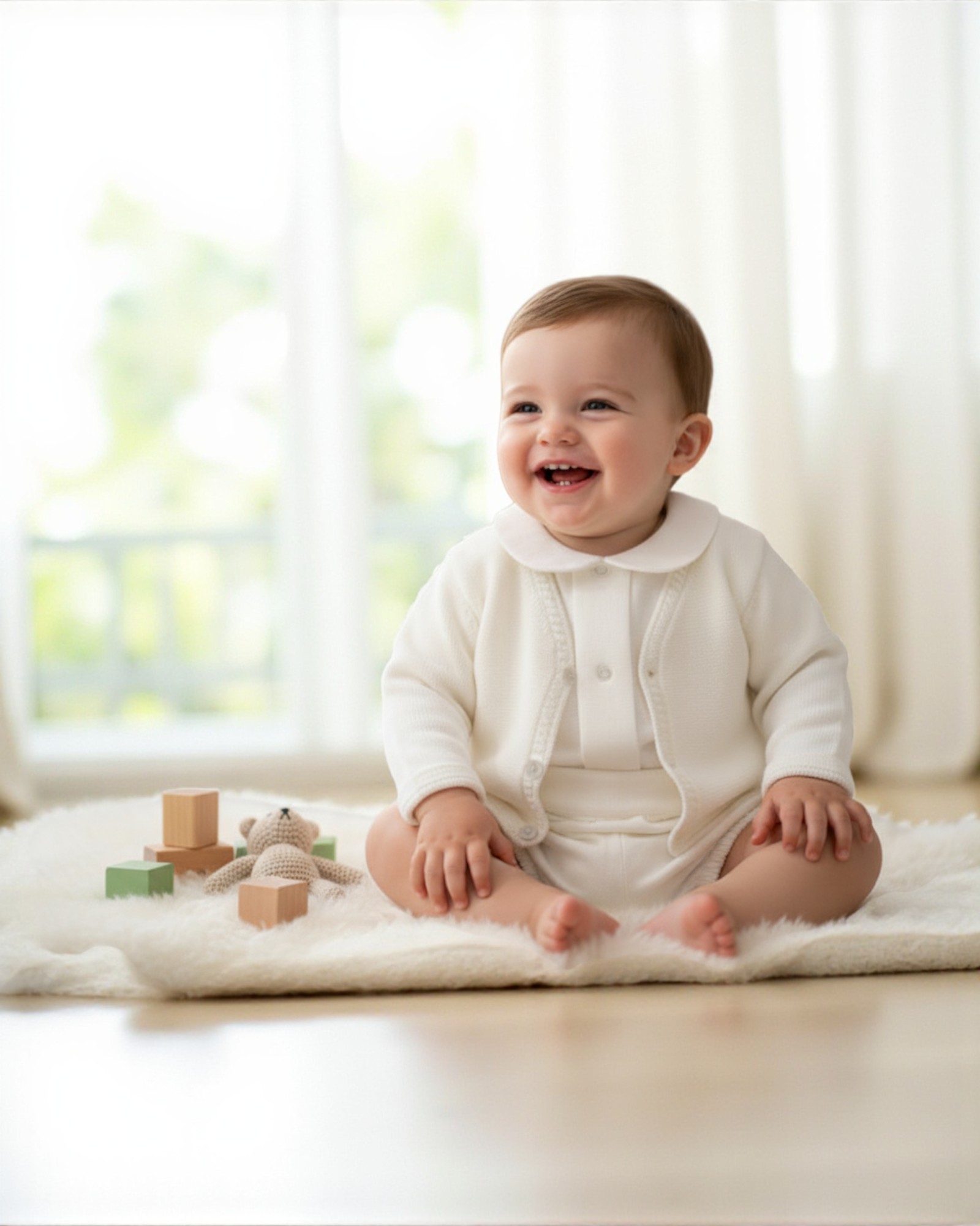 Con un diseño clásico y delicado, su cuello en pico y botones frontales permiten vestirlo con facilidad sin perder estilo. El tono crudo aporta serenidad y distinción, ideal para combinar con conjuntos de ceremonia o ropa especial de bebé niño, realzando su look sin excesos y con mucho encanto.