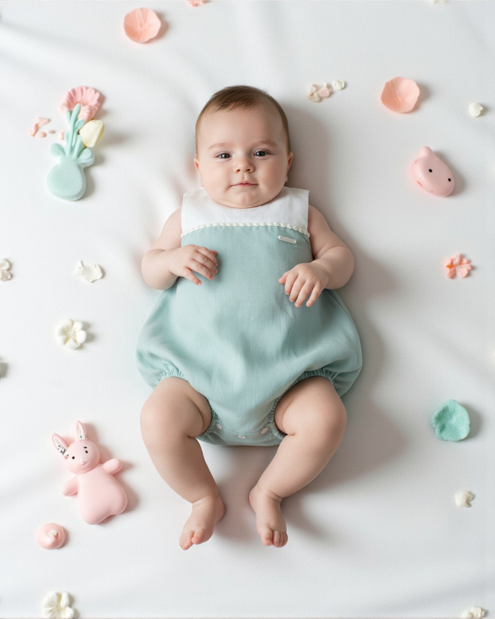 Confeccionada en un suave tejido de lino natural, esta ranita de bebé niño combina el tono crudo en la pechera con un elegante verde agua en el cuerpo. El diseño sin mangas, con tirantes amplios y cuello sencillo, está adornado con una discreta pasamaneria en la unión de colores, aportando un aire clásico con un toque renovado. Disponible desde los 3 hasta los 12 meses.